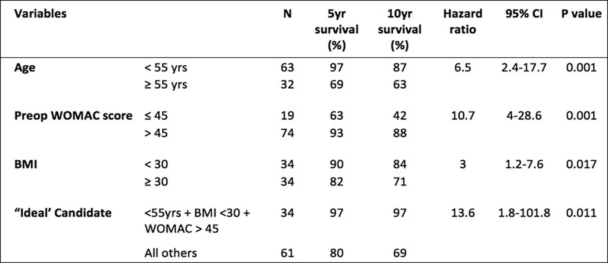 Overall survivorship of HTO in this series was found to be 87% at 5 years and 79% at 10 years. This is comparable to previous results from the wider published literature. Functional outcome following surgery was also demonstrated to be good, with WOMAC and Knee Society Scores improving significantly from preoperatively and being maintained over 10 years. Favourable longevity of HTO was associated with 3 key factors: higher preoperative patient reported outcome scores (WOMAC > 45), age < 55 and a BMI <30, and in this “ideal patient” cohort 10 year survivorship was 97%. In patients over 55 years of age with adequate preoperative functional scores, survivorship can be good and reported functional outcomes can be significantly better than their younger counterparts. We recommend the routine use of preoperative functional, outcome scores to guide decision-making when considering patient suitability for HTO (Table 3).