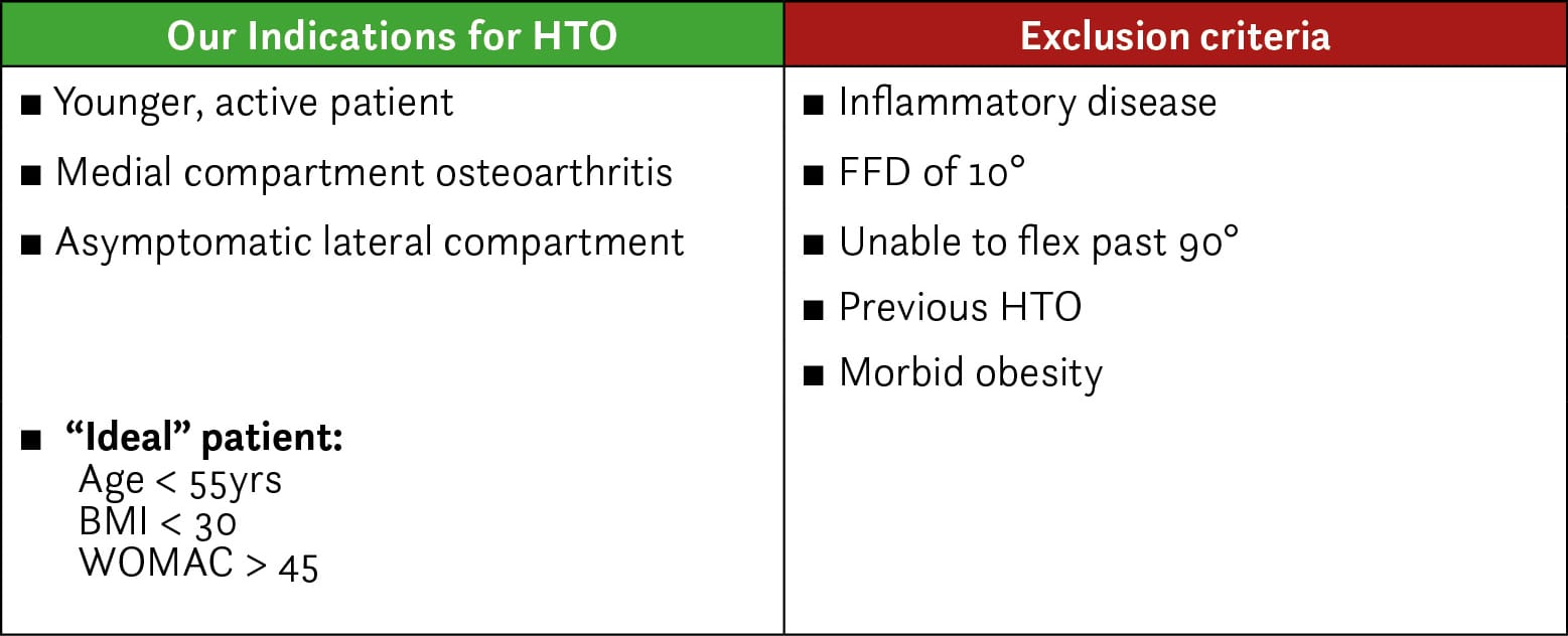 In this article we will outline our favoured surgical technique for HTO, including a rationale for our choice, and then provide a detailed description. We will also emphasise our patient selection criteria and present the supporting research.