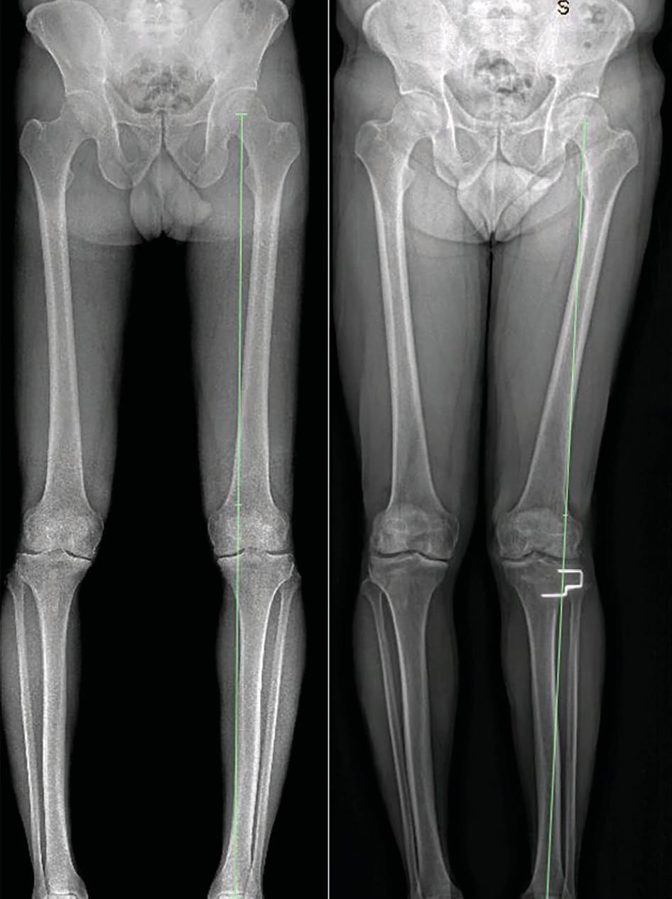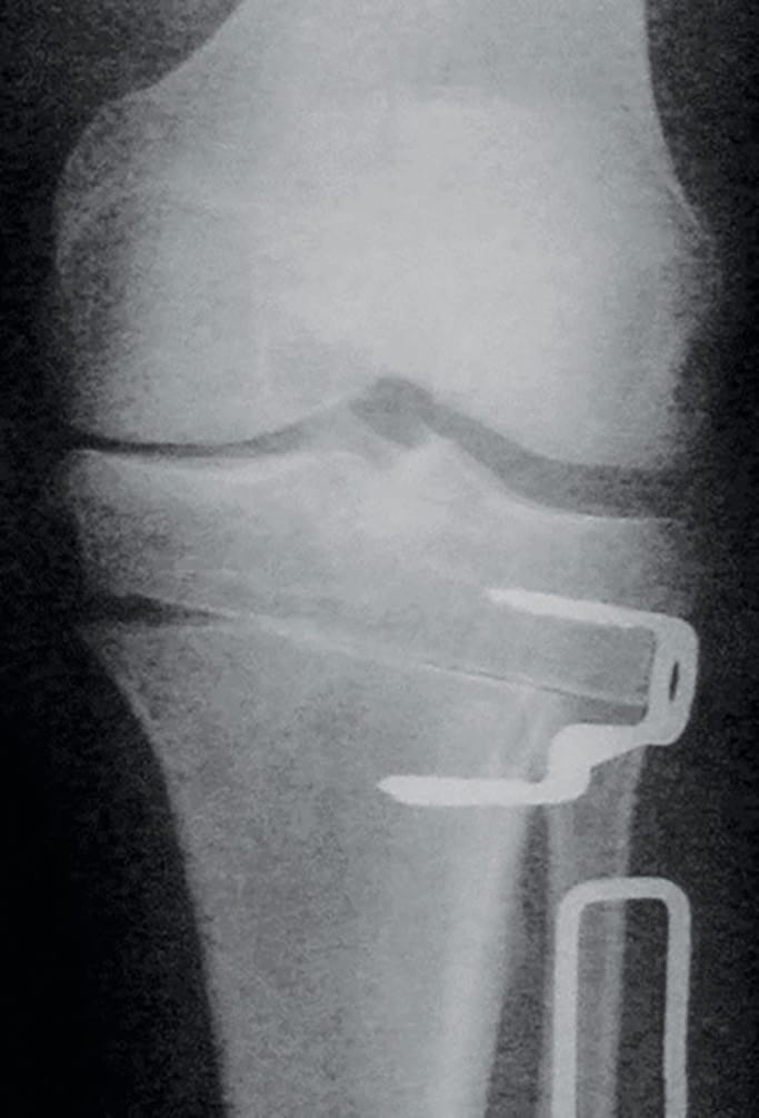 High tibial osteotomy (HTO) is a well-established surgical technique for the management of medial compartment osteoarthritis of the knee in the young, active patient; in this group, partial and total knee replacements are reported to have high failure rates [1] Australian Orthopaedic Association National Joint Replacement Registry. Annual Report 2017. Available at: https://aoanjrr.sahmri.com/documents/10180/397736/Hip%2C%20Knee%20%26%20Shoulder%20Arthroplasty. Accessed March 10, 2018. 2017.. The purpose of HTO is to shift the lower limb mechanical axis laterally to redistribute weight-bearing forces away from the worn medial compartment and through the preserved lateral compartment (Figure 1). This relieves pain and can encourage fibrocartilagenous regrowth over the eburnated medial femoral condyle. When successful, HTO permits high levels of activity, has excellent long term outcomes, and is readily revised to TKR if required. Furthermore, TKR performed after HTO has similar outcomes to primary TKR [2] Ramappa M, Anand S, Jennings A. Total knee replacement following high tibial osteotomy versus total knee replacement without high tibial osteotomy: a systematic review and meta analysis. Archives of orthopaedic and trauma surgery. 2013 Nov;133(11):1587-93. PubMed PMID: 23959070..