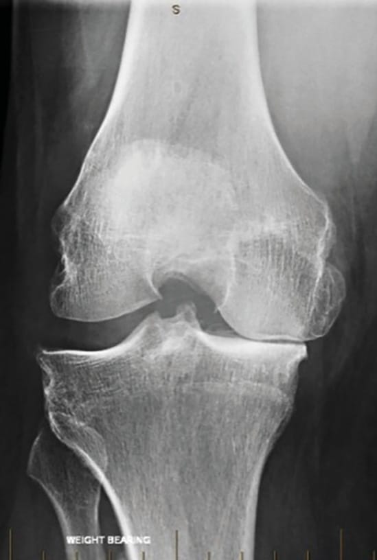 In the clinic we ensure the patient is suitable - typically the younger, more active patient with medial compartment OA, who experiences pain with medial compartment loading, and has radiographic evidence of >50% medial joint space loss (Figure 2). We exclude patients with symptomatic OA of the lateral compartment, those with inflammatory arthritis, and those with a fixed flexion deformity of >10° or flexion range <90°. Age, weight and WOMAC score are important factors that will be discussed further. It is important to pre-operatively demonstrate the pain experienced with varus loading through the medial (diseased) compartment, and the relief of pain on valgus loading through the lateral compartment; this confirms the suitability of the patient for HTO, and is instructive to the patient. Finally, we assess integrity of the MCL, making note of patients with more than 3mm of laxity to valgus stress.