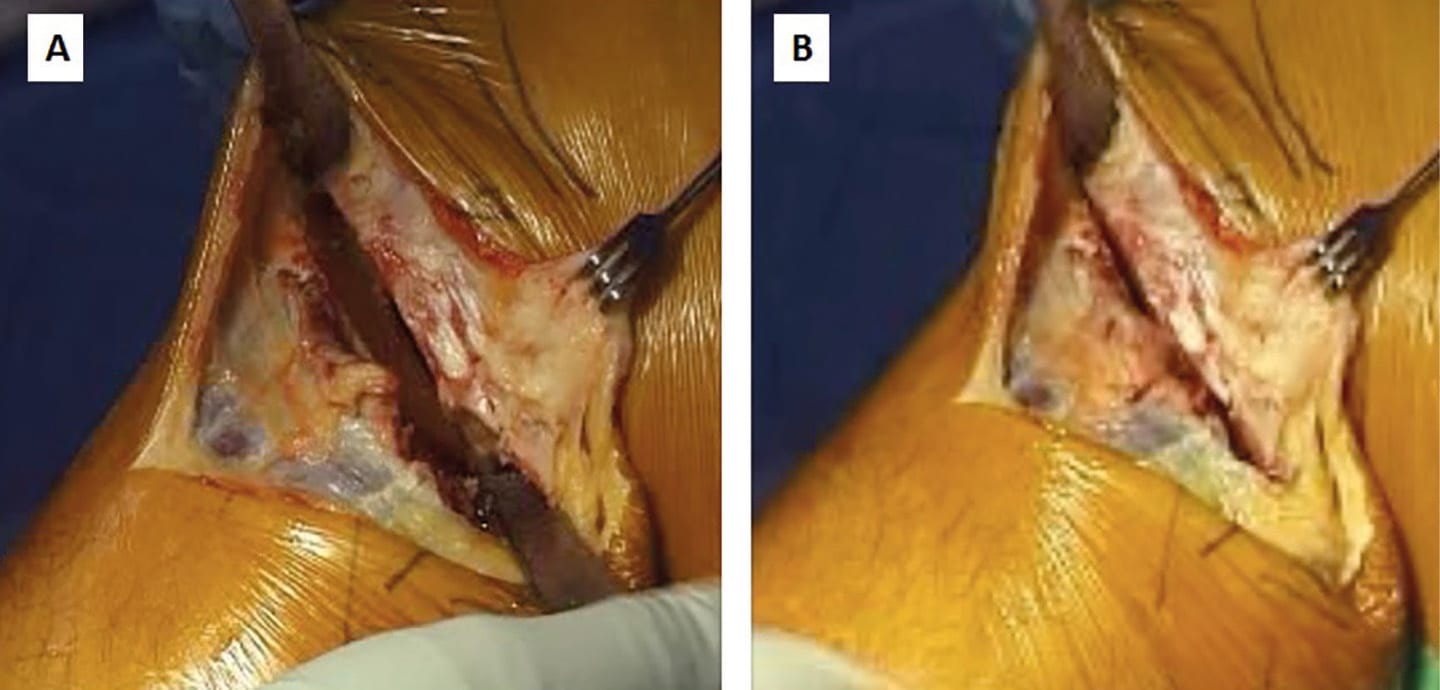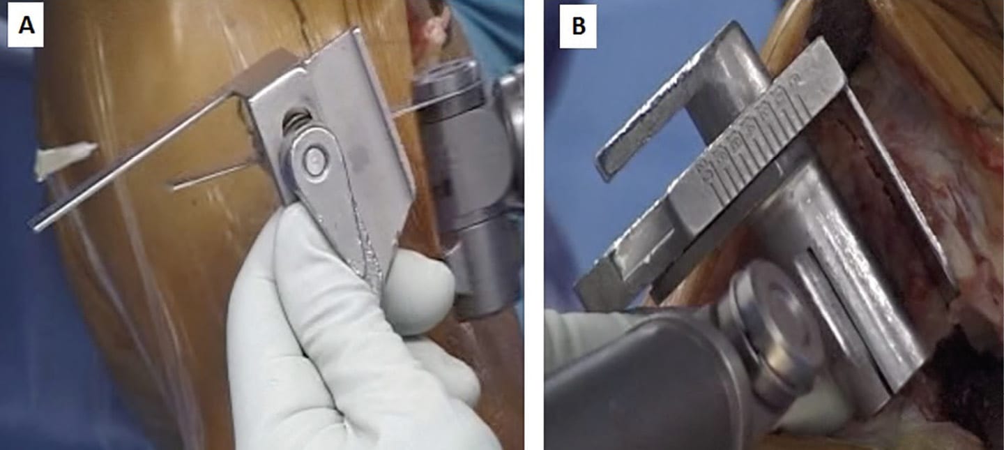 The patient is administered a general anaesthetic, and a foot bolster and side support setup to support the knee at 90° in a supine position. A single dose of prophylactic antibiotics is administered. A thigh tourniquet is applied and the limb exsanguinated.