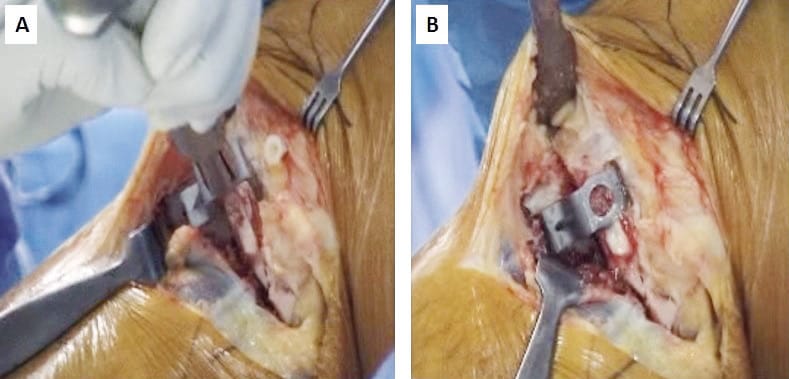 A posterolateral hockey-stick incision is made adjacent to the fibular head to follow the course of the common peroneal nerve. The initial step is to isolate the nerve, and it is carefully protected throughout the case. The proximal tibiofibular joint is excised, but the soft tissue attachments to the fibula styloid are preserved. To protect the neurovascular structures and soft tissues during the osteotomy, we undertake sub-periosteal dissection of the anterior and posterior aspects of the tibia and place Hohman’s retractors around the entire tibia. The first osteotomy is made at the level of the tibiofibular joint, usually 15mm distal to the level of the plateau, and parallel to the joint line. The oscillating saw is stopped short of the far medial cortex is so as to leave an intact “hinge” of cortex and periosteum. An angular jig is set to the planned osteotomy angle and the second (distal) osteotomy completed using the first osteotomy as a reference (Figure 3).