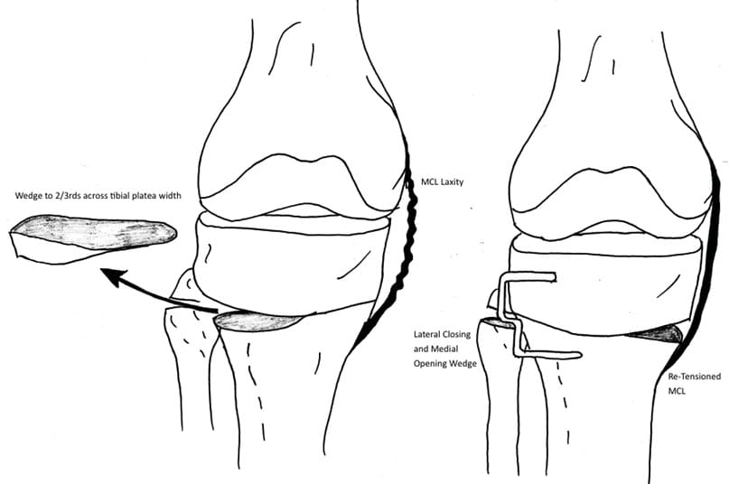 A lateral closing wedge high tibial osteotomy is our preferred surgical option - it is an inherently stable osteotomy. There is a large surface area of metaphyseal bone under compression, and this keeps the endosteal bone gap to less than 0.5mm, which allows for primary healing and bone healing by 3-4 weeks. A single metallic Krakow staple avoids the risk of prominent hardware, and bone grafting is not required. A closing wedge HTO is readily converted to TKR, and has outcomes similar to a primary TKR. Finally, it has been shown that closing wedge HTO decreases posterior tibial slope, and produces excellent long term results in the ACL deficient knee [3] Hui C, Salmon LJ, Kok A, Williams HA, Hockers N, van der Tempel WM, et al. Long-term survival of high tibial osteotomy for medial compartment osteoarthritis of the knee. The American journal of sports medicine. 2011 Jan;39(1):64-70. PubMed PMID: 20833833..