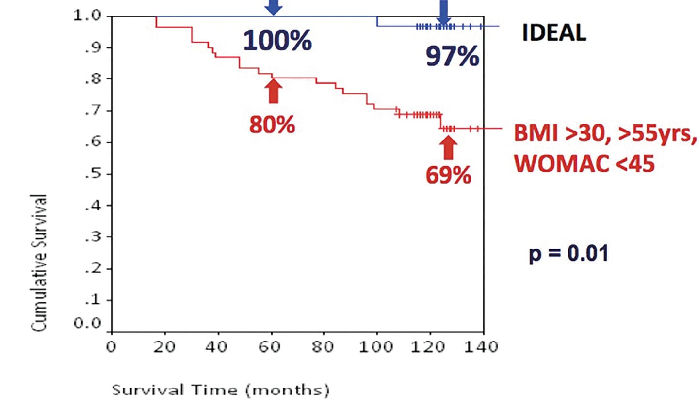 When all subjects were pooled, survival of the HTO was 87% at 5 years and 79% at 10 years. At 10 years 74 of 95 patients had no further surgery and 21 subjects had undergone a total knee replacement (at a mean of 5 years). Importantly, the survival rate for the “ideal” candidate (<55yrs + BMI<30 + Preop WOMAC>45) was 97%. In distinction, for patients with unfavourable results in these three variables pre-operatively (>55yrs + BMI >30 + Preop WOMAC < 45) the survival rate was only 69% (Figure 8). There was a significant difference between the groups (P=0.01).