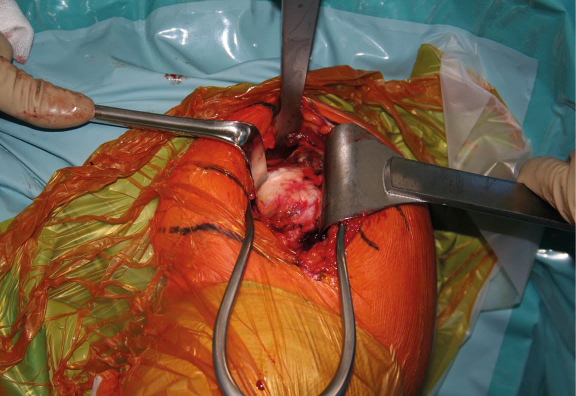 Nevertheless, this technique is possible, albeit more difficult, with a 42mm glenosphere or a bone or metal offset [43] Collin P, Liu X, Denard PJ, et al. Standard versus bony increased-offset reverse shoulder arthroplasty: a retrospective comparative cohort study. J Shoulder Elbow Surg 2017. DOI: 10.1016/j.jse.2017.07.020.. We use a baseplate that already incorporates a 2mm lateral offset; any greater could prevent sufficient exposure of the humerus and encourage iatrogenic tuberosity fractures due to excessive traction on the anterior and posterior rotator cuff muscles. However, the prevalence of these fractures is comparable to the rate of “controlled” fractures of the lesser tuberosity during deltopectoral approaches involving posterior humeral dislocation. Finally, damage to the anterior deltoid muscle could cause a problem. If there is any doubt, the arm is slightly abducted to release the tension, with the deltoid muscle protected using a sponge, and large Brown retractors are used.
