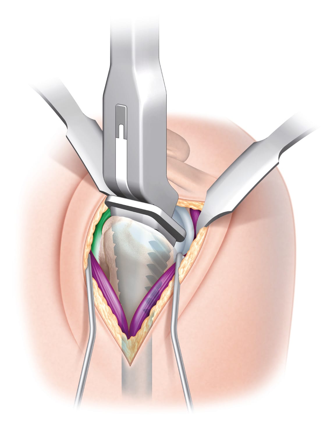 allows better visibility and access to the humerus, better positioning of the glenoid component and a lower risk of loosening and scapular notching. [1] Mole D and Favard L. [Excentered scapulohumeral osteoarthritis]. Rev Chir Orthop Reparatrice Appar Mot 2007; 93: 37-94. Congresses 2007/12/13. However, it also carries a higher risk of anterior dislocation and so the required degree of deltoid tension [2] Lädermann A, Lubbeke A, Collin P, et al. Influence of surgical approach on functional outcome in reverse shoulder arthroplasty. Orthopaedics & traumatology, surgery & research : OTSR 2011; 97: 579-582. Multicenter Study 2011/08/25. DOI: 10.1016/j.otsr.2011.04.008. places patients at risk of a neurological injury. [3] Lädermann A, Lubbeke A, Melis B, et al. Prevalence of neurologic lesions after total shoulder arthroplasty. J Bone Joint Surg Am 2011; 93: 1288-1293. 2011/07/28. DOI: 10.2106/JBJS.J.00369. In addition, although the subscapularis tendon is often reconstructed after a tenotomy, the healing, integrity and therefore the function of this structure may still be compromised. [4], Buckley T, Miller R, Nicandri G, et al. Analysis of subscapularis integrity and function after lesser tuberosity osteotomy versus subscapularis tenotomy in total shoulder arthroplasty using ultrasound and validated clinical outcome measures. J Shoulder Elbow Surg 2014; 23: 1309-1317. DOI: 10.1016/j.jse.2013.12.009.[5], Denard PJ and Lädermann A. Immediate versus delayed passive range of motion following total shoulder arthroplasty. J Shoulder Elbow Surg 2016; 25: 1918-1924. DOI: 10.1016/j.jse.2016.07.032.[6], Jackson JD, Cil A, Smith J, et al. Integrity and function of the subscapularis after total shoulder arthroplasty. J Shoulder Elbow Surg 2010; 19: 1085-1090. DOI: 10.1016/j.jse.2010.04.001.[7], Liem D, Kleeschulte K, Dedy N, et al. Subscapularis function after transosseous repair in shoulder arthroplasty: transosseous subscapularis repair in shoulder arthroplasty. J Shoulder Elbow Surg 2012; 21: 1322-1327. Comparative Study 2011/12/24. DOI: 10.1016/j.jse.2011.09.022.[8] Miller SL, Hazrati Y, Klepps S, et al. Loss of subscapularis function after total shoulder replacement: A seldom recognized problem. J Shoulder Elbow Surg 2003; 12: 29-34. DOI: 10.1067/mse.2003.128195. Subsequent subscapularis insufficiency appears to be a cause of poor outcomes [5], Denard PJ and Lädermann A. Immediate versus delayed passive range of motion following total shoulder arthroplasty. J Shoulder Elbow Surg 2016; 25: 1918-1924. DOI: 10.1016/j.jse.2016.07.032.[9], Lapner PL, Wood KS, Zhang T, et al. The return of subscapularis strength after shoulder arthroplasty. J Shoulder Elbow Surg 2015; 24: 223-228. DOI: 10.1016/j.jse.2014.06.042.[10] Scheibel M and Habermeyer P. Subscapularis dysfunction following anterior surgical approaches to the shoulder. J Shoulder Elbow Surg 2008; 17: 671-683. DOI: 10.1016/j.jse.2007.11.005. and even of failure for a shoulder arthroplasty [11] Melis B, Bonnevialle N, Neyton L, et al. Glenoid loosening and failure in anatomical total shoulder arthroplasty: is revision with a reverse shoulder arthroplasty a reliable option? J Shoulder Elbow Surg 2012; 21: 342-349. DOI: 10.1016/j.jse.2011.05.021.. This has prompted surgeons to consider other surgical options to avoid having to detach the subscapularis tendon during the procedure, or to improve its postoperative recovery. One alternative technique is to use a superolateral approach, whose main advantage is better postoperative stability because the anterior structures, including the ligament complexes, are spared.[12] Mole D, Wein F, Dezaly C, et al. Surgical technique: the anterosuperior approach for reverse shoulder arthroplasty. Clin Orthop Relat Res 2011; 469: 2461-2468. Review 2011/03/31. DOI: 10.1007/s11999-011-1861-7. Although this technique has been producing good outcomes, it involves dissection of the deltoid muscle which carries a risk of anterior deltoid weakening (mechanical or neurological, or due to damage to the distal branches of the axillary nerve) [2] Lädermann A, Lubbeke A, Collin P, et al. Influence of surgical approach on functional outcome in reverse shoulder arthroplasty. Orthopaedics & traumatology, surgery & research : OTSR 2011; 97: 579-582. Multicenter Study 2011/08/25. DOI: 10.1016/j.otsr.2011.04.008. and of impaired postoperative function [13] Lädermann A, Walch G, Denard PJ, et al. Reverse shoulder arthroplasty in patients with pre-operative impairment of the deltoid muscle. The bone & joint journal 2013; 95-B: 1106-1113. 2013/08/03. DOI: 10.1302/0301-620X.95B8.31173..