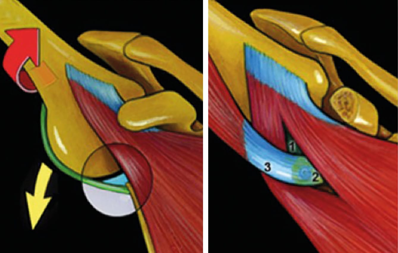 Coracoid transfer to treat anterior shoulder instability, first proposed by French surgeon Michel Latarjet in 1954 and popularized by Gilles Walch, is increasingly used in cases of glenoid deficiency, hyperlaxity, and revision anterior stabilization. The technique has 2 main advantages: [1] Latarjet M. A propos du traitement des luxations récidivantes de l’épaule. [Treatment of recurrent dislocations of the shoulder]. Lyon Chir 1954;49:994-7. it allows reconstruction of the glenoid bone loss by expanding the surface area of the glenoid for continued contact with the humeral head (static glenohumeral stabilization), and [2] Walch G, Boileau P. Latarjet-Bristow procedure for recurrent anterior instability. Tech Shoulder Elbow Surg 2000;1:256-61. it reinforces the weak and stretched inferior glenohumeral ligament by transferring the conjoint tendon closer to the joint and lowering the inferior part of the subscapularis (dynamic sling or seat-belt stabilization). Recent biomechanical studies have suggested that the sling effect is most responsible for the stabilizing effect of the Latarjet. Together with the reattachment of the labrum and capsule (i.e., Bankart repair), it allows “triple locking” of the shoulder (Didier Patte). The 2B3 (Latarjet+ Bankart) (Figure 1) procedure yields good results with a low rate of recurrent instability, a high rate of return to sport to preinjury levels, and a high rate of patient satisfaction.