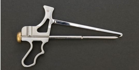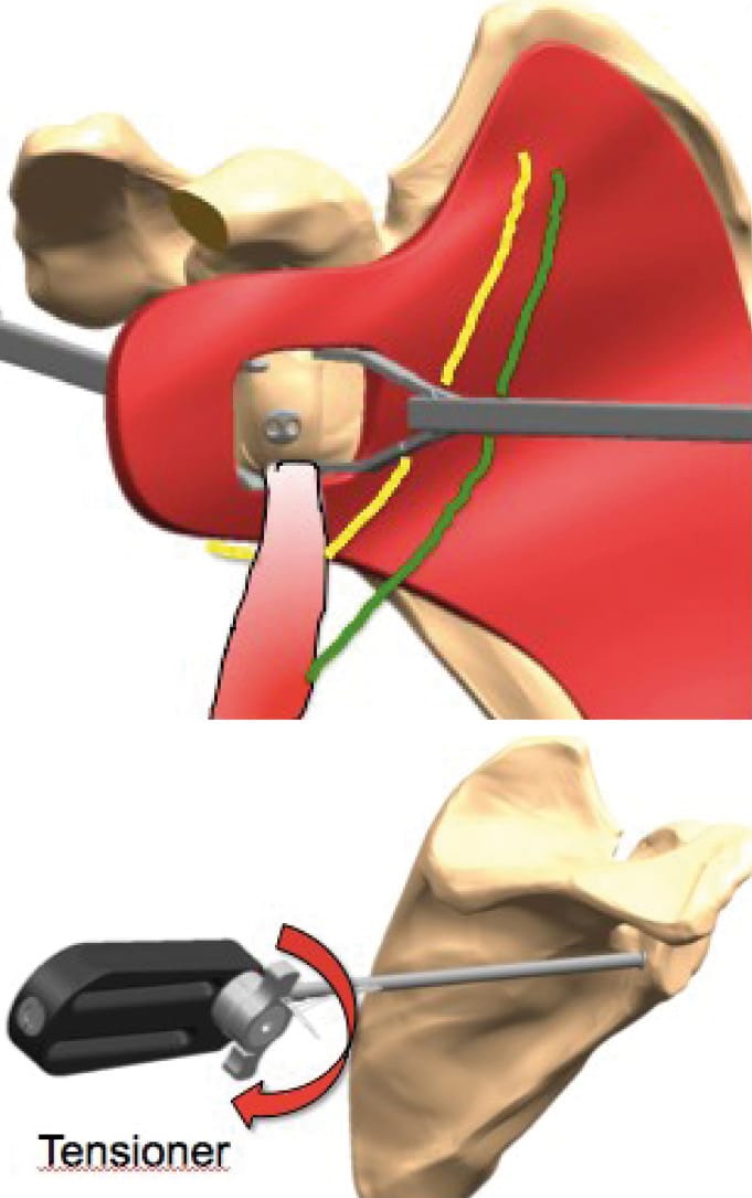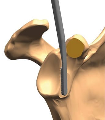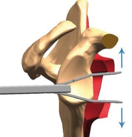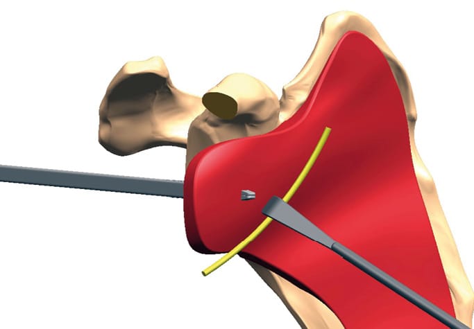 Slide the open spreader medially and under the glenoid neck. Together, the spreaders create a “safe window” through the subscapularis muscle.