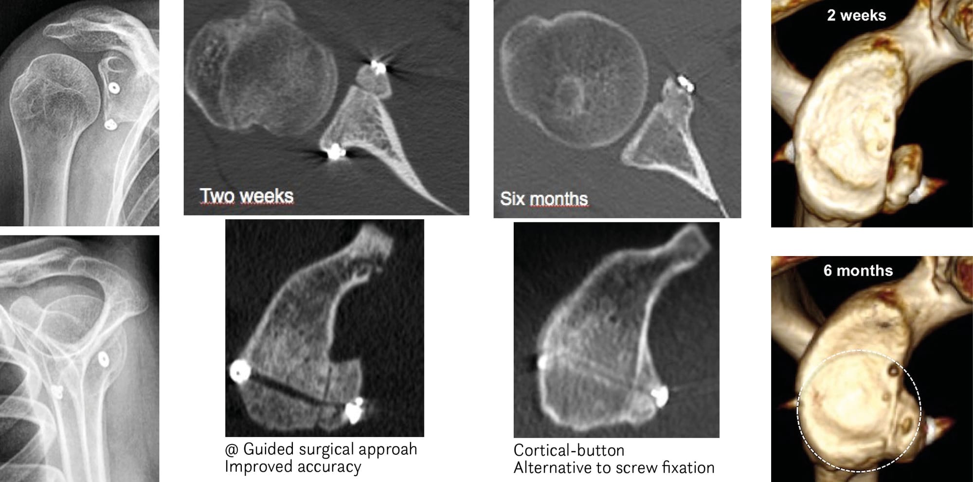 In a recent prospective study (Boileau et al., JSES 2016), we have evaluated the accuracy of graft position and healing of this guided technique and novel fixation method. Radiographs and CT-scan images were performed at 2 weeks and 6 months postoperatively in 76 patients. Our study demonstrates that: