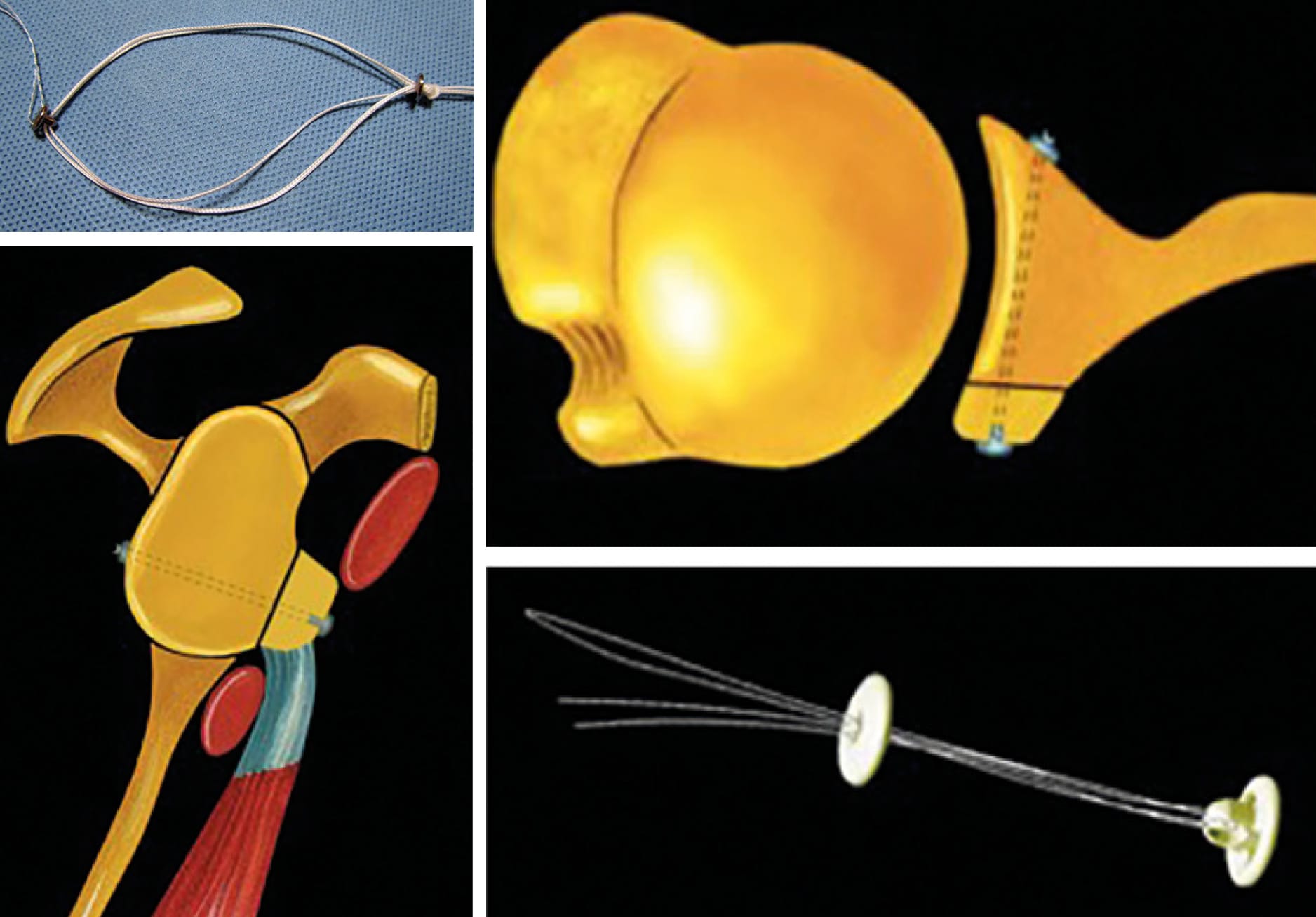 Two cortical-button devices were developed to facilitate coracoid graft fixation and healing. It consists of two circular metallic buttons, with a number 3-4 ultra–high molecular weight polyethylene (UHMWP) suture sling running through them (Figure 4). The coracoid (anterior) button is convex (to adapt to the coracoid shape) and pegged to prevent the suture from cutting through the bone prior to bone union. The glenoid (posterior) button has one hole allowing suture passage. The sliding-locking knot (Nice Knot), tied posteriorly, is bulky and cannot pass through the posterior button. Then bone block compression is obtained with using a tensioner.