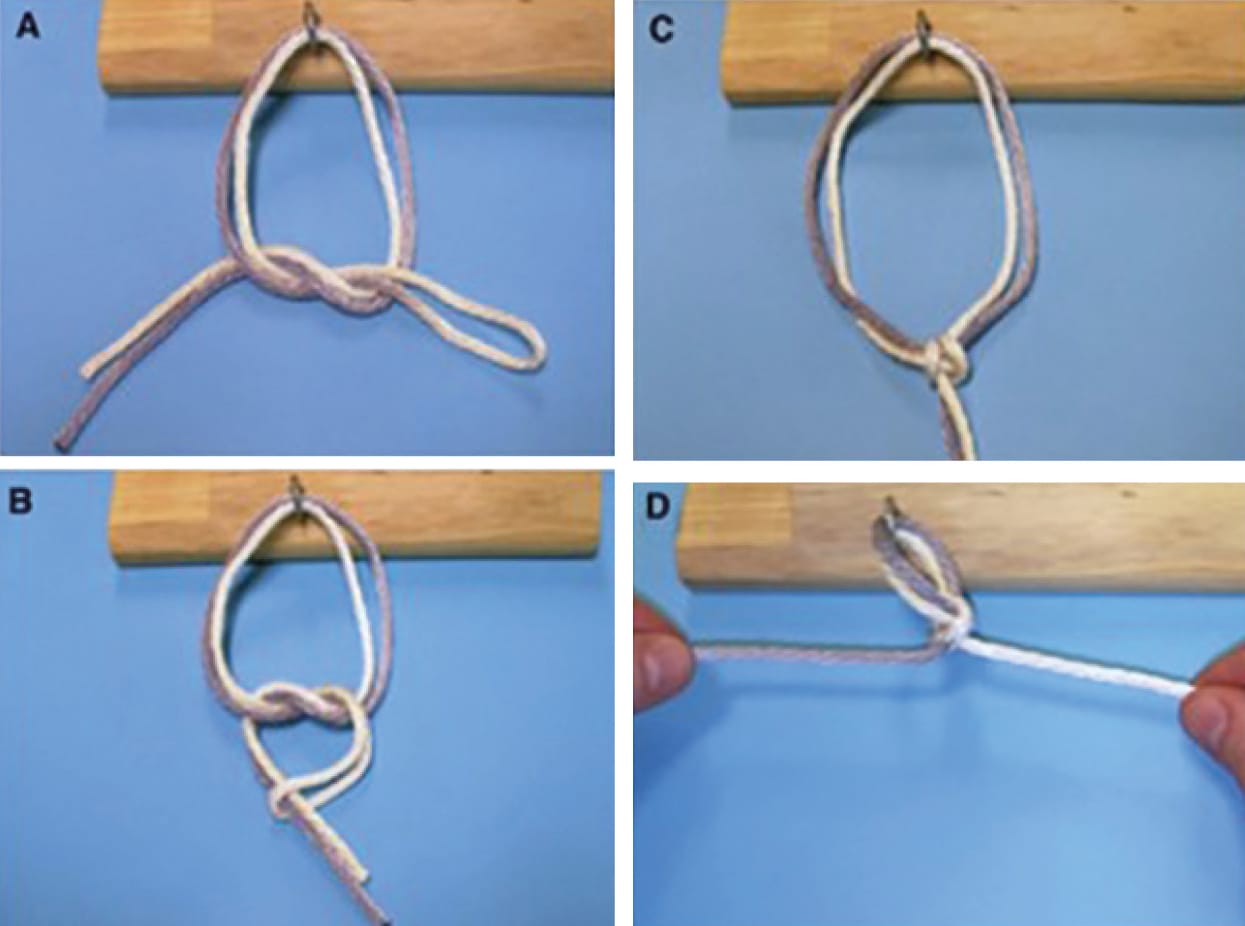Tie a Nice knot (sliding-locking knot) making sure that the loop with the blue-white CobraidTM remnant is the Post.