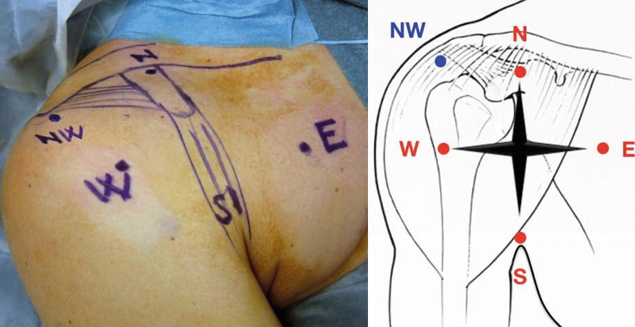 • North-West (NW) : Located at the antero-lateral corner of the acromion; this is the rotator interval portal used to work inside the joint.