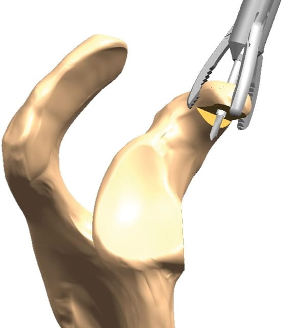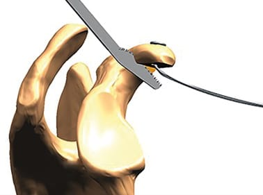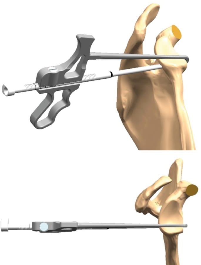 Introduce the Coracoid Guide through the (N) portal and grasp the coracoid perpendicular to its surface. To achieve this, the guide must be titled 45° medially (i.e., you must see the medial arm of the guide, under the coracoid).