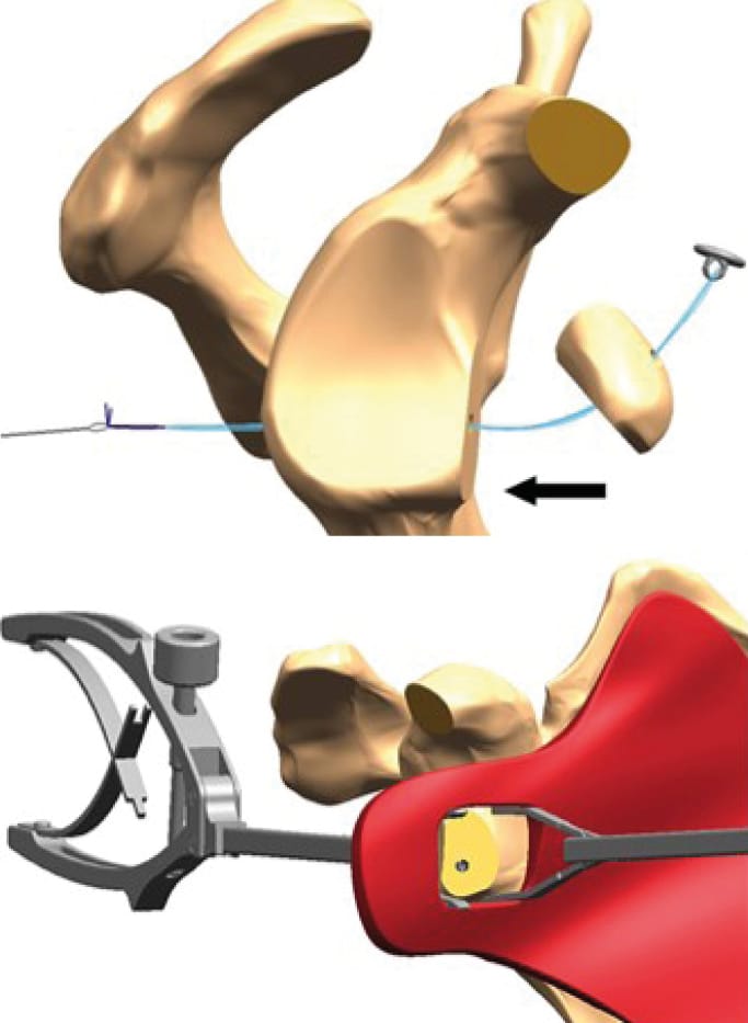 Introduce the Coracoid Grasper through the (S) portal, and use it to help for the transfer and adjust the rotation of the bone block (in order to be flush with the glenoid surface).