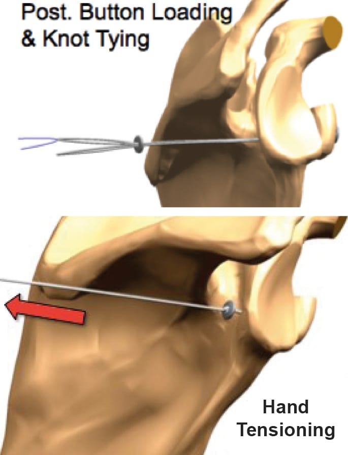 From the (NW) portal, pull the PDS suture to draw the white suture bundle and then the anterior cortical peg-button into the hole in the coracoid.
