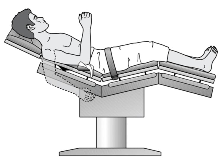 Using a movable arm support (SPIDER Limb Positioner, Smith & Nephew) place the shoulder in 60° of flexion (to relax the anterior deltoid) and 30° of internal rotation (to increase the space under the coracoid process and relax the axillary nerve). Place the elbow at 90° of flexion (to relax the conjoint tendon).