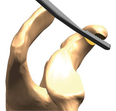 Place the Glenoid Guide flush to the glenoid at 5 o'clock position (in a right shoulder), with the tip of the hook over the glenoid rim.