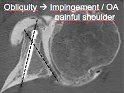 First, positioning the bone block flush with the glenoid and the screws parallel is technically difficult. Many complications related to this procedure are attributed to graft malposition. The obliquity of the scapula on the thorax makes it challenging to place the screws exactly parallel to the glenoid surface. Excessive screw obliquity may cause impingement with the humeral head, leading to rapid-onset arthropathy (Figure. 2).