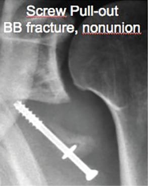 Second, although fixation of the graft with two bicortical metal screws is the recommended method of fixation, it is recognized as the main source of intraoperative and postoperative complications. There are several potential disadvantages of screw fixation: screw pullout (Figure 3), loosening, bending or breakage, bone block fracture, nonunion, or resorption (3%-28%), and graft migration (4%-11%). Some of these complications may be serious and symptomatic enough to warrant reoperation in young and active patients.