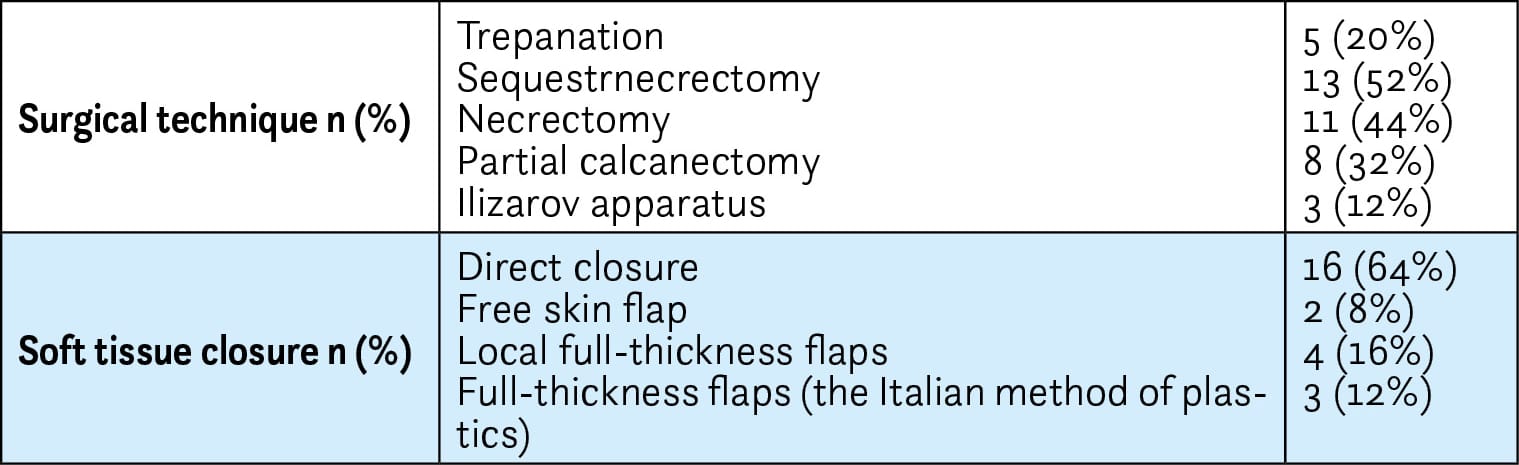 If a primary wound closure is not possible it can be achieved by various plastic procedures including free muscle flaps (serratus anterior, gracilis), or local flaps (rotational flaps, abductor digiti minimi flap, neurocutaneous or fasciomusculocutaneous flaps). Skin grafting with a rotational flap using local tissues (Qarris and Saad method) was performed in 4 patients, wounds in 2 patients were closed with free split skin flaps. The reviewed studies showed no difference in the reinfection rate and failure rate of the flaps. However, the choice of soft tissue coverage should be based on the location and size of the soft tissue defect. Direct closure with the adjacent normal skin is preferable, but small defects may be reliably covered by local pedicle flaps [1], Sabater-Martos M., Sigmund I.K., Loizou C., McNally M. Surgical treatment and outcomes of calcaneal osteomyelitis in adults: A systematic review. J Bone Jt Infect. 2019;4:146-54. doi: 10.7150/jbji.34452[47] Boffeli T.J., Collier R.C. Near total calcanectomy with rotational flap closure of large decubitus heel ulcerations complicated by calcaneal osteomyelitis. J Foot Ankle Surg. 2013;52(1):107-112.. Disadvantages of free vascularized flaps are the need of microsurgery, long operation time, and prolonged hospital stay combined with higher costs. They are also usually insensate, producing a later risk of pressure ulceration. Regardless of which coverage is used, the applied procedure should guarantee an improved bone vascularization and a good dead space management to avoid haematoma formation [1], Sabater-Martos M., Sigmund I.K., Loizou C., McNally M. Surgical treatment and outcomes of calcaneal osteomyelitis in adults: A systematic review. J Bone Jt Infect. 2019;4:146-54. doi: 10.7150/jbji.34452[48] Attinger C., Cooper P. Soft tissue reconstruction for calcaneal fractures or osteomyelitis. Orthop Clin North Am. 2001;32(1):135–170..