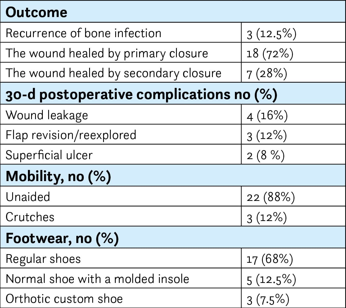 Outcomes, complications, and clinical function are summarized in table 3. Infection was successfully eradicated in 22 patients at 1-year follow-up. Wounds healed by primary intention in 18 (72%) patients. Postoperative complications occurred in 9 patients (36 %) including wound leakage in 4 patients and recurrence of the osteomyelitis process occurred in 3 patients. All of them underwent successful reoperations with necrectomy. Wounds in the plantar surface of the heel developed in 2 patients after 6 months and was not associated with recurrent osteomyelitis. After conservative treatment they have healed.