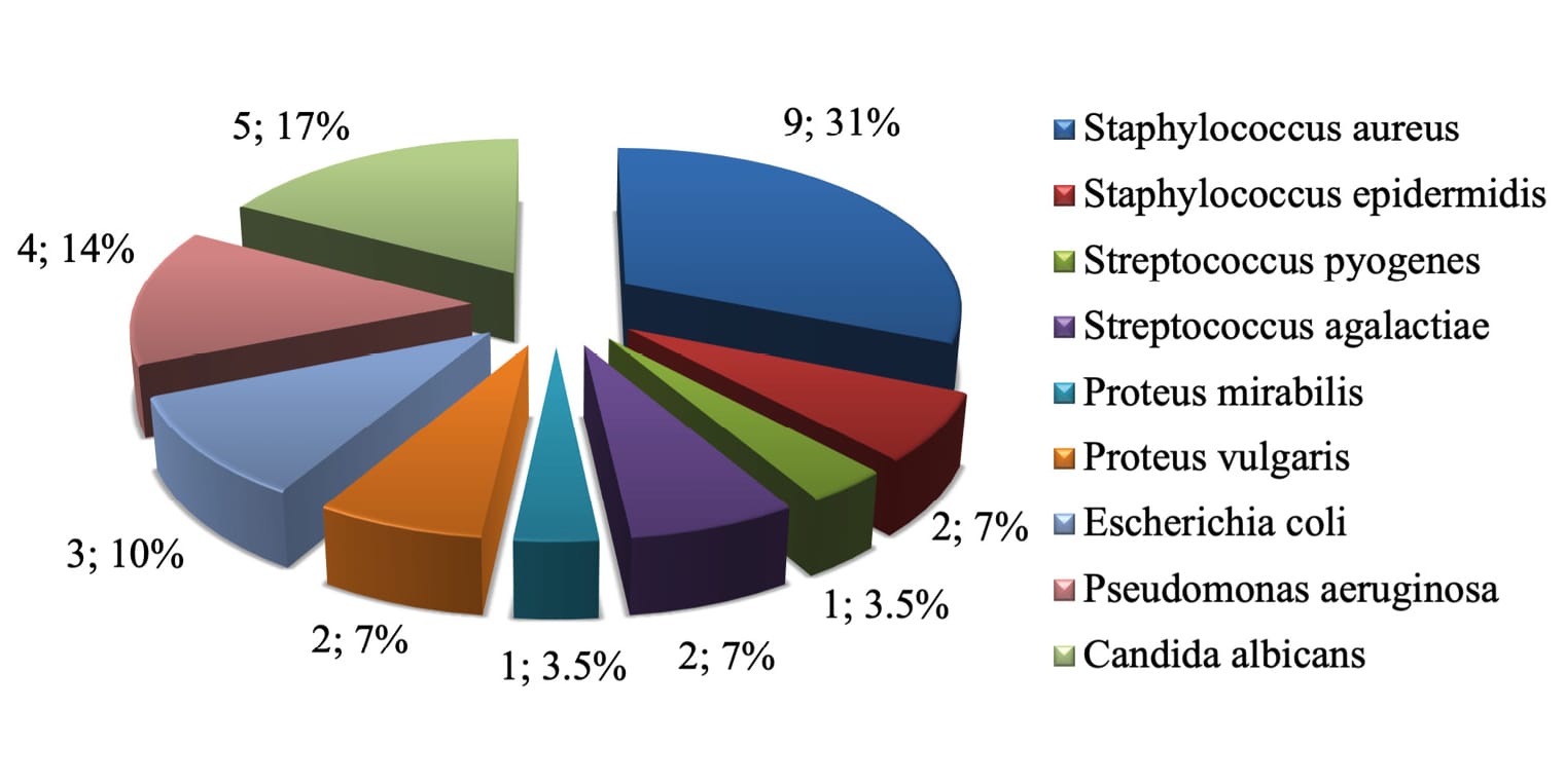 Cultures taken from the deeper aspect of the wound are summarized in Diagram 1. They included facultative anaerobe Gram-positive cocci: Staphylococcus aureus (31%), Staphylococcus epidermidis (7%), Streptococcus pyogenes (3.5%), Streptococcus agalactiae (7%); facultative anaerobe Gram-negative bacillus: Enterobactericeae family: Escherichia coli (10%), Proteus mirabilis (3.5%); Proteus vulgaris (7%); anaerobe nonfermentive Gram-negative bacillus: Pseudomonas aeruginosa (14%); form endosymbiotic fungi: Candida albicans (17%). All of the cultured microorganisms were sensitive to vancomycin and/or gentamycin (Diag.1).