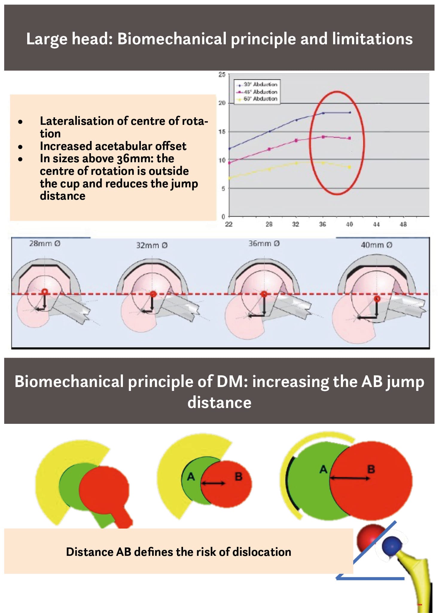 Every option has a long list of advantages and disadvantages. Large femoral heads improve the head–neck ratio, which decreases the theoretical risk of dislocation [7] Howie DW, Holubowycz OT, Middleton R, Large Articulation Study Group. Large femoral heads decrease the incidence of dislocation after total hip arthroplasty: a randomized controlled trial. J Bone Joint Surg Am 2012;94:1095–102. https://doi.org/10.2106/JBJS.K.00570.. However, this method often produces insufficient stability in the context of revision, especially for patients who have undergone a wide synovectomy or who have hip abductor deficiency. Ultimately, the underlying mechanical concept behind the use of large femoral heads is that increasing the jump distance protects against dislocation (Figure 1). However, increasing the head diameter beyond 36mm leads to increased acetabular offset and a lateralised centre of rotation. The centre of rotation is outside the cup and the jump distance (the safety distance that protects against dislocation) is paradoxically decreased.