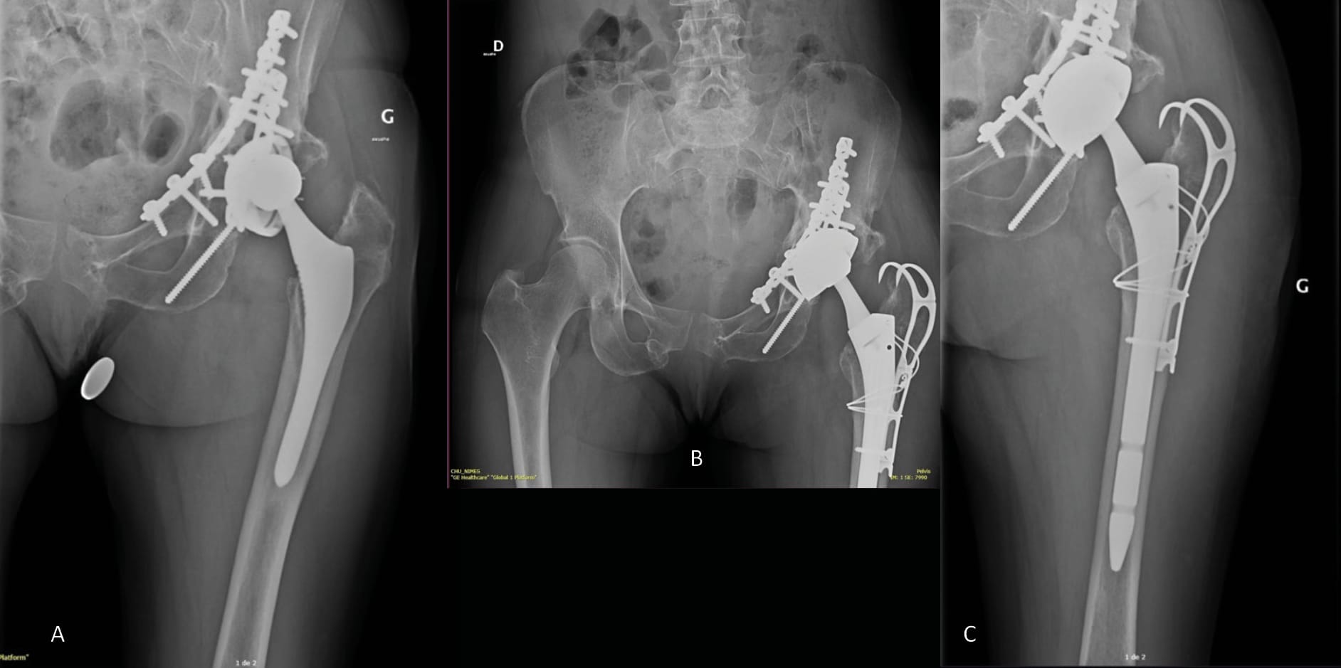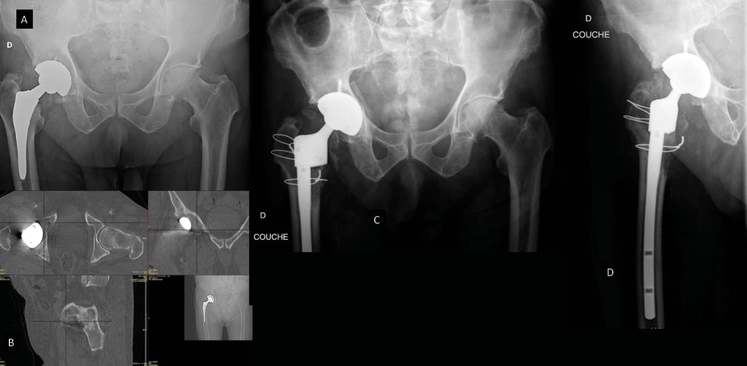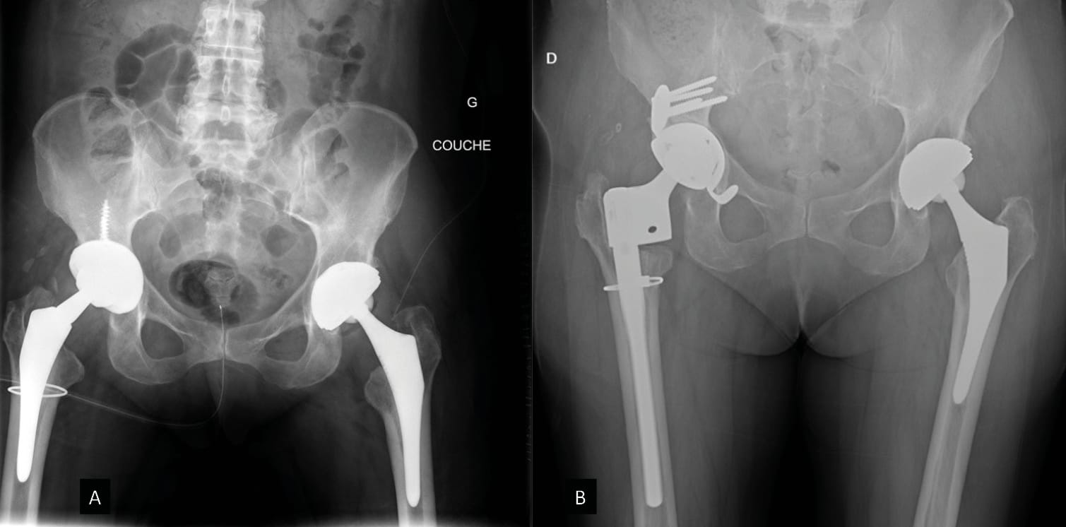 As part of a strategy that aims for bone reconstruction using a bone graft (autologous, allograft [54] Strahl A, Boese CK, Ries C, Hubert J, Beil FT, Rolvien T. Outcome of different reconstruction options using allografts in revision total hip arthroplasty for severe acetabular bone loss: a systematic review and meta-analysis. Arch Orthop Trauma Surg 2023. https://doi.org/10.1007/s00402-023-04843-9. or substitute [55] Romagnoli M, Casali M, Zaffagnini M, Cucurnia I, Raggi F, Reale D, et al. Tricalcium Phosphate as a Bone Substitute to Treat Massive Acetabular Bone Defects in Hip Revision Surgery: A Systematic Review and Initial Clinical Experience with 11 Cases. J Clin Med 2023;12:1820. https://doi.org/10.3390/jcm12051820.), indicated when there is moderate to significant loss of bone capital, it is often necessary to use an acetabular reinforcement device. Of the devices currently on the market, the Kerboull cross-plate is probably one of the most widely used in France and across Europe. As well as offering mechanical reinforcement, it also helps to restore the centre of rotation of the acetabular component and delivers primary stability that is adequate for subsequent integration of the bone graft. It requires precise positioning, which involves using the cross design as a guide to placement with the hook, centre and pallet in the vertical plane and the horizontal flanges in the horizontal plane, then the pallet should be in the horizontal plane parallel to the operating table. Achieving this final point sometimes requires a bone graft to be positioned between the pallet and the roof of the acetabulum [56] Assi C, Caton J, Aslanian T, Samaha C, Yammine K. The cross technique for the positioning of Kerboull plate in acetabular reconstruction surgery. SICOT-J 2018;4:20. https://doi.org/10.1051/sicotj/2018012.. If integrity of the U-figure (or pelvic tear drop, a bony ridge at the inferior medial acetabulum and overhanging the obturator foramen) is required to ensure stability, a structural graft to reconstruct this bony ridge is by default necessary [56] Assi C, Caton J, Aslanian T, Samaha C, Yammine K. The cross technique for the positioning of Kerboull plate in acetabular reconstruction surgery. SICOT-J 2018;4:20. https://doi.org/10.1051/sicotj/2018012.. Wegrzyn et al. carried out a study that aimed to evaluate the findings of a continuous and prospective case series of 61 revision THA with reconstruction of AAOS grade III and IV acetabular bone defects using a Kerboull cross-plate, structural allograft and cemented DM cup with a minimum follow-up of 5 years and a mean of 7.5 years. They reported no instability, and there was no failed acetabular reconstruction observed in 98% of the cases that presented complete osteointegration of the bone graft. Finally, no sign of mechanical rupture of the Kerboull cross-plate and/or loosening of the cemented cup were seen. As reported in other similar studies [19], Ciolli G, Mesnard G, Deroche E, Gunst S, Batailler C, Servien E, et al. Is Cemented Dual-Mobility Cup a Reliable Option in Primary and Revision Total Hip Arthroplasty: A Systematic Review. J Pers Med 2022;13:81. https://doi.org/10.3390/jpm13010081.[27], Assi C, Caton J, Fawaz W, Samaha C, Yammine K. Revision total hip arthroplasty with a Kerboull plate: comparative outcomes using standard versus dual mobility cups. Int Orthop 2019;43:2245–51. https://doi.org/10.1007/s00264-018-4209-z.[57] Bozon O, Dagneaux L, Sanchez T, Gaillard F, Hamoui M, Canovas F. Influence of dual-mobility acetabular implants on revision and survivorship of cup and Kerboull-type reinforcement ring constructs in aseptic acetabular loosening. Orthop Traumatol Surg Res OTSR 2022;108:103071. https://doi.org/10.1016/j.otsr.2021.103071., this reconstruction technique has produced excellent results at midpoint follow-up in terms of preventing instability after revision, restoring acetabular bone stock and stable cemented fixation of the dual mobility cup.