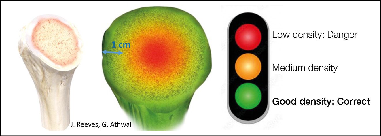 Whether coated with sandblasted titanium, porous titanium or calcium hydroxyapatite, the fixation systems for these implants are designed to obtain a good primary press-fit, bearing in mind that bone density is optimum in the first centimetre beneath the head cut and densest in the outer ring (1cm) rather than in the middle. [3] Reeves JM, Athwal GS, Johnson JA. An assessment of proximal humerus density with reference to stemless implants. J Shoulder Elbow Surg. 2018; 27:641-649. doi: 10.1016/j.jse.2017.09.019. (Fig 7).