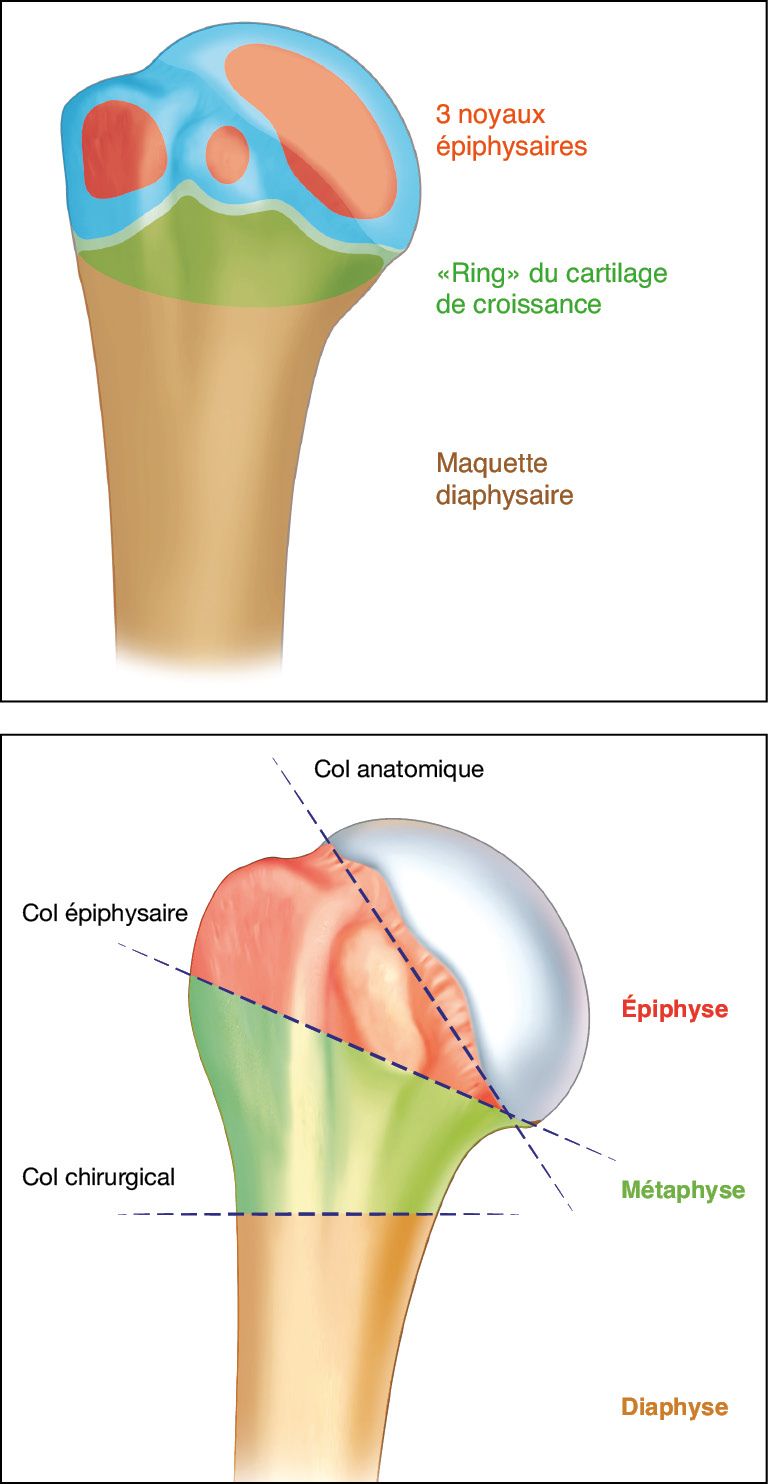 The cup arthroplasty, first suggested by Steve Copeland in 1986, [2] Levy O, Copeland SA. Cementless surface replacement arthroplasty of the shoulder. 5- to 10-year results with the Copeland mark-2 prosthesis. J Bone Joint Surg Br. 2001;83:213-21. was appealing due to the bone sparing and good outcomes for a humeral hemiarthroplasty. However, preserving the head made it extremely difficult to access the glenoid cavity and it was impossible to ensure correct implantation of the glenoid component for a total arthroplasty. The stemless concept is based on an implant impacted into the superior end of humerus after resecting the head. It comprises a large six-branched anchor designed for epiphysometaphyseal fixation. Developmental anatomic analysis of the humeral head reveals that the epiphysis is formed of three ossification centres (humeral head, greater tuberosity and lesser tuberosity) which fuse at age 7 to create a common epiphyseal mass; the funnel joining this mass to the diaphysis at the surgical neck forms the metaphysis (Fig. 3).