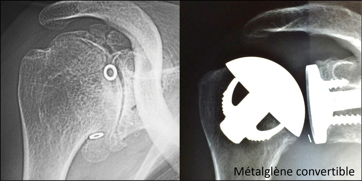 Post-instability osteoarthritis, which usually occurs in relatively young subjects with good quality bone, is a good indication for a minimally-invasive anatomical TSA. A universal metaglene component should be recommended so that it can be converted to a reverse implant, should the instability recur or should there be loosening of subscapularis weakened by a previous bone block (Fig. 13).