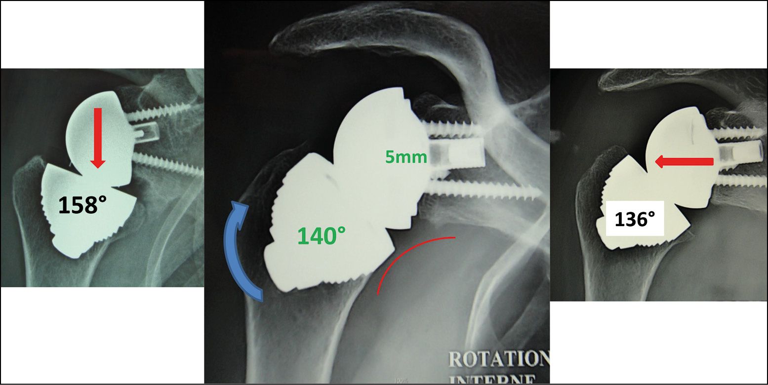 One of the benefits of stemless is the ability to freely modify the neck-shaft angle, which we initially recommended at 150° but now advise 135° or 140° to avoid notching, improve rotational range and achieve a better shoulder-humerus arch to ensure a good balance between humeral lateralisation and lowering (Fig. 16).