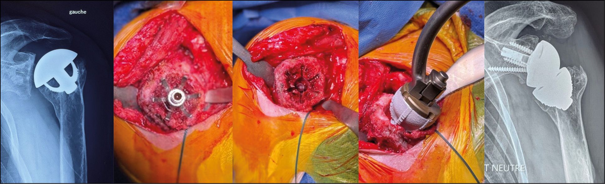 Minimally-invasive conversion of TSAa to TSAr in case of cuff failure following stemless anatomical arthroplasty: if a conversion to reverse is required, it can sometimes be possible to keep the stemless implant, especially if either or both of the humeral and glenoid components are universal. If the humeral component is not convertible, its mandatory removal does not preclude the use of another stemless implant, provided the epiphyseal bone has not been overly weakened (Fig. 17).