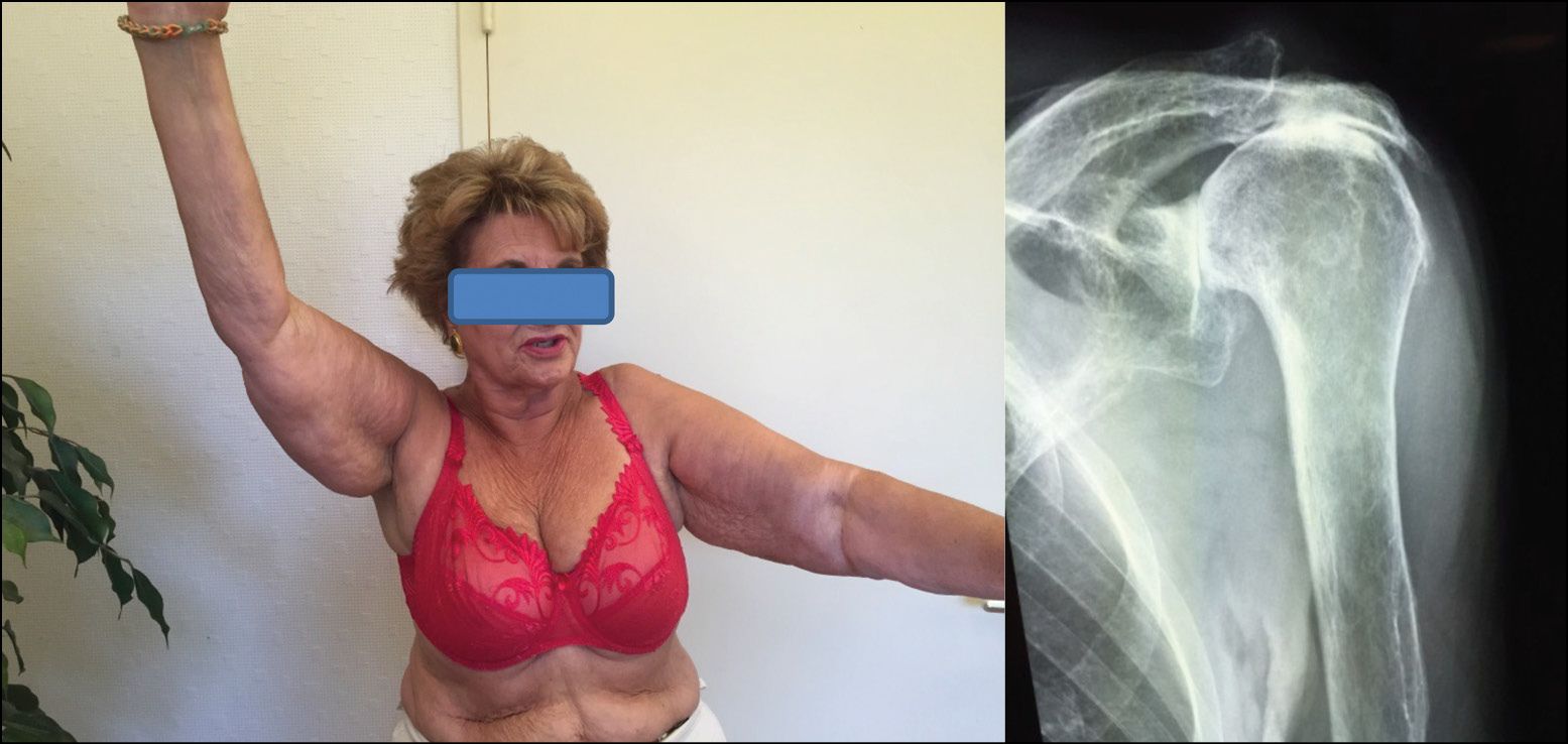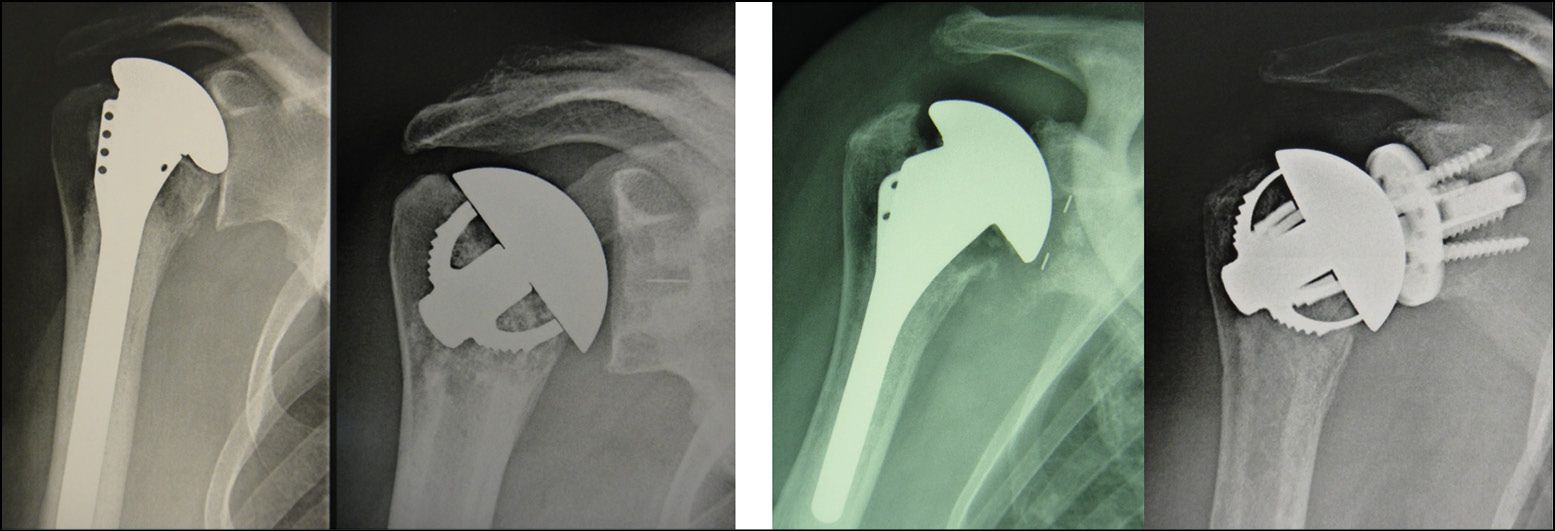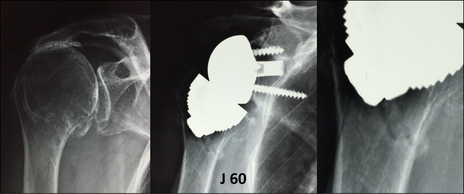 Osteoarthritis with rotator cuff tear in a young subject is a good indication for a reverse replacement because the absence of a stem makes the procedure less invasive (Fig. 14). Complex malunion can also be treated with a stemless reverse TSA, since the procedure removes the need for any diaphyseal or tuberosity transfer thus avoiding any corrective osteotomy which is rarely beneficial (Fig. 15).