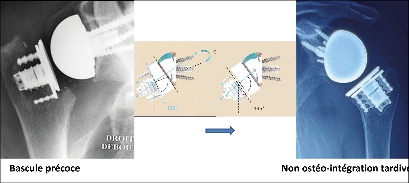 Inlay designs such as the TESS and Lima SMR S give satisfactory mid and long-term outcomes. [11], Adjibade D, Clark Y, Wiater J M et al. Prothèse totale d’épaule inversée sans tige : une revue systématique. JSES may 2022- 5 – 1083-1095[12] Kostretzis L, Papadopoulos P, Stemless reverse shoulder arthroplasty : a systematic review of contemporary literature, Musculoskeletal surgery 2021 apr 17 Istituto Rizzoli Onlay models give varying results: the Nano Revers from Zimmer-Biomet, introduced in 2013, was recalled in 2017 due to tilt and loosening [13] Galhoum S Mohamed et al. Anatomic and reverse stemless shoulder arthroplasty : fonctional and radiological evaluation JSEA 2022 vol 6. 1-10 The Easytech reverse onlay from FX Solutions, launched in 2012, also initially had problems with tilt and poor osseointegration, which appear to have been resolved by changing the cut from 135° to 145° and a symmetric PE (Fig. 24).