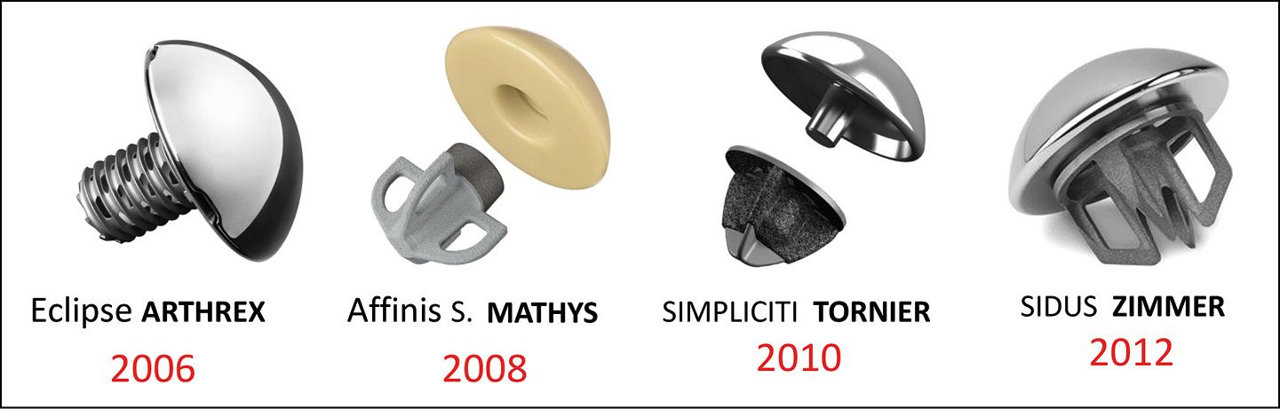 After presenting the outcomes of the TESS implant, we witnessed a first wave of stemless designs comprising the Eclipse Arthrex in 2006, the Affinis Short Mathys in 2008, the Simpliciti Tornier in 2010, and the Sidus Zimmer in 2012. They were all available in an anatomical version only (Fig. 4).