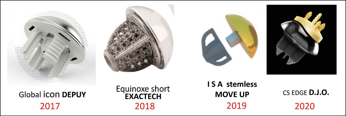 Finally, the third and most recent waves of stemless designs, exclusively anatomical, comprised the Global Icon DePuy in 2017, the Equinoxe Short from Exactech in 2018, the Isa Stemless from Move-Up in 2019, and the CS Edge from DJO in 2020 (Fig. 6).