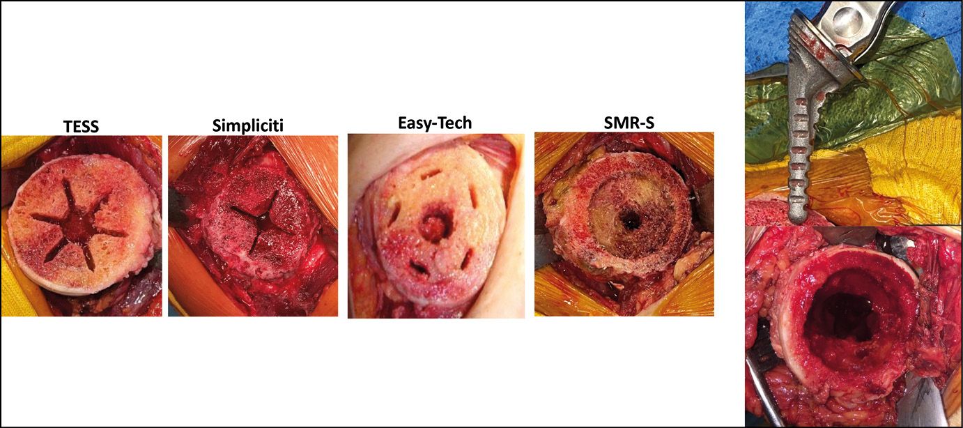 The imprints left in the epiphysis by these various stemless designs show the bone sparing compared to designs with stems, even short ones (Fig. 8).