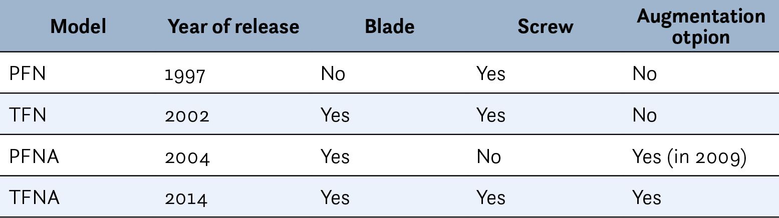Cemented augmentation was introduced by spinal surgery with pedicle screw augmentation. For the trochanteric nail, Depuy-Synthes incorporated the augmentation option into their arsenal in 2009 on the PFNA® (Proximal Femoral Nail Antirotation), which was released five years earlier. This option did not exist on their two previous nails, the PFN® (Proximal Femoral Nail) and the TFN® (Titanium Fixation Nail). However, it was extended to the TFNA® (TFN-Advanced), ten years after the release of their last trochanteric nail (Table 1).