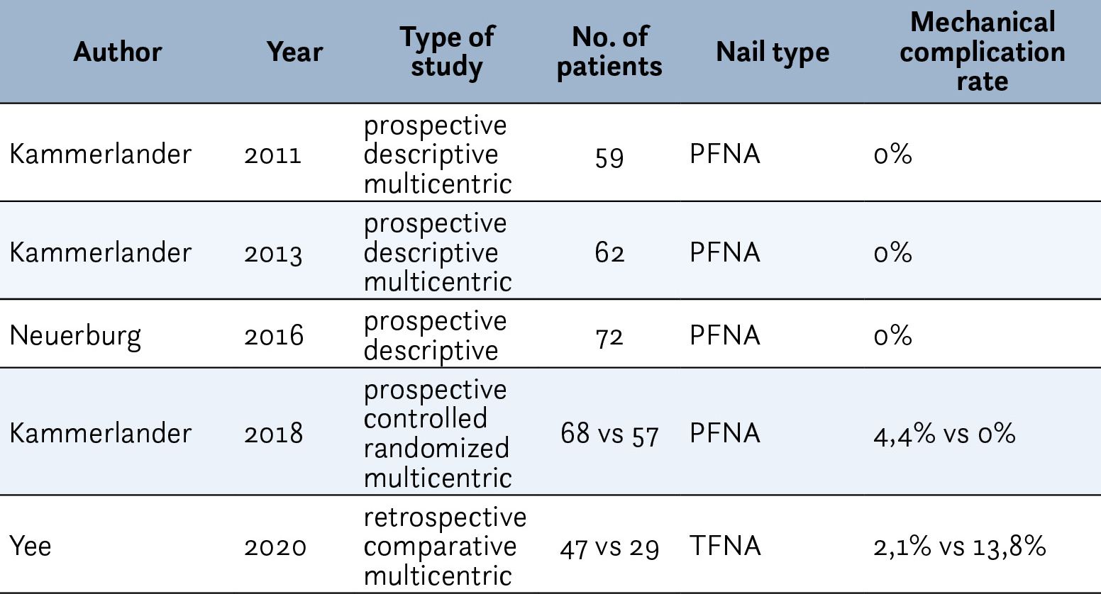 Kammerlander's findings were confirmed by Neuerburg in 2016 [11] Neuerburg C, Mehaffey S, Gosch M, Böcker W, Blauth M, Kammerlander C. Trochanteric fragility fractures. Oper Orthop Traumatol. 2016;28(3):164-176. . In his series of 72 patients, he described no cases of mechanical complications.