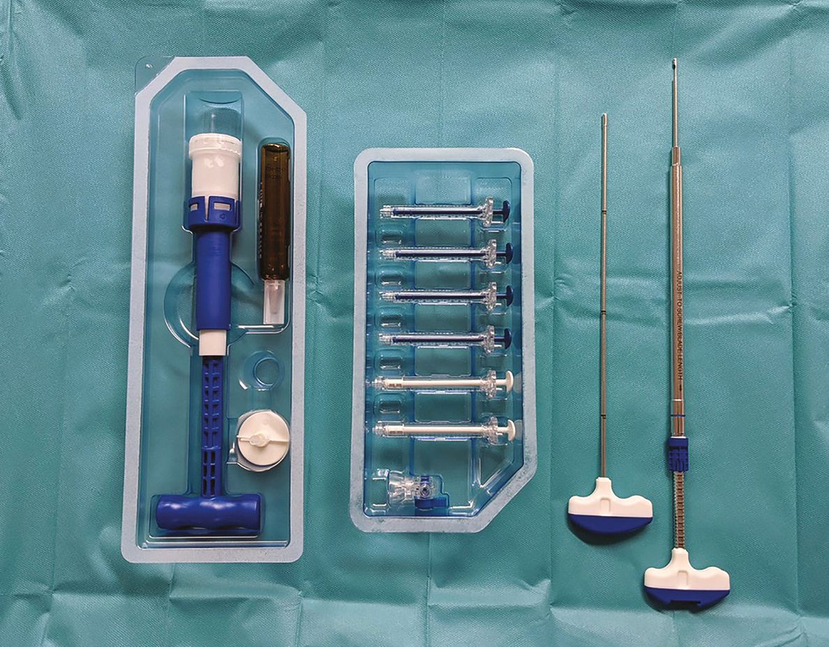 The two white 2 mL syringes are connected (screwed) and emptied into the injection cannula to purge it (Figure 4B). After filling with the two white syringes, the entire cannula is filled with cement, which begins to extrude from the distal part of the cannula (Figure 4C). The injection cannula can then be inserted into the proximal targeting system until it stops and augmentation can begin (Figure 4D).