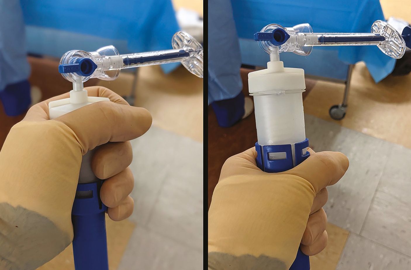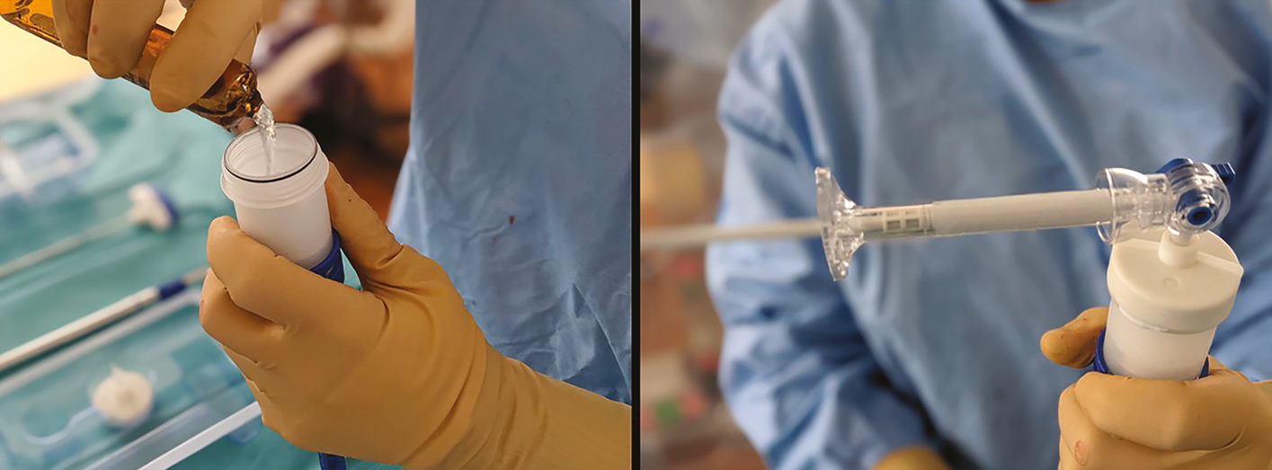NB: During these steps, the person preparing the cement will tend to place one hand around the transparent part of the mixer, for better ergonomics. However, the hands should remain on the blue part of the mixer so as not to heat the cement and accelerate its setting (Figure 3).