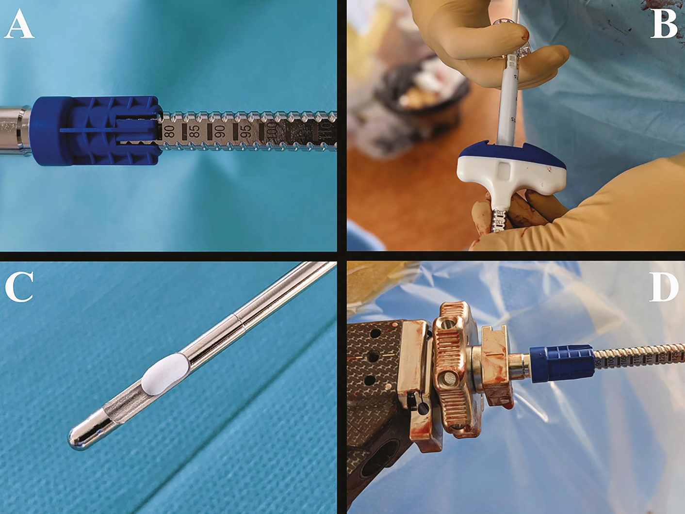 The length of the cannula varies according to the length of the implanted neck screw. Before filling it with cement, this length must be adjusted using a sleeve that can be screwed or unscrewed. The cannula is graduated and the sleeve should be positioned on the number corresponding to the length of the neck screw (Figure 4A).