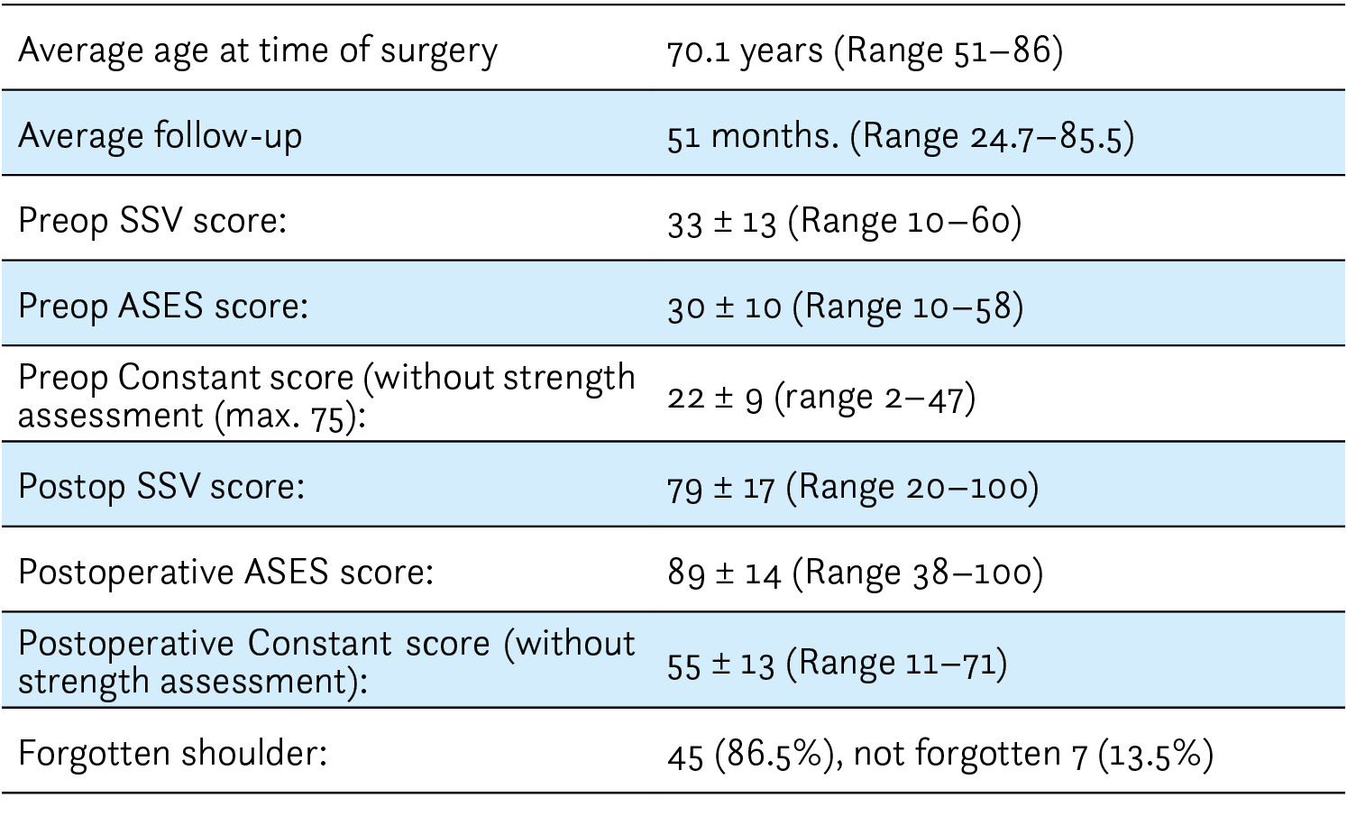 for the 52 patients with 52 reverse stemless arthroplasties are summarized in Table 1.