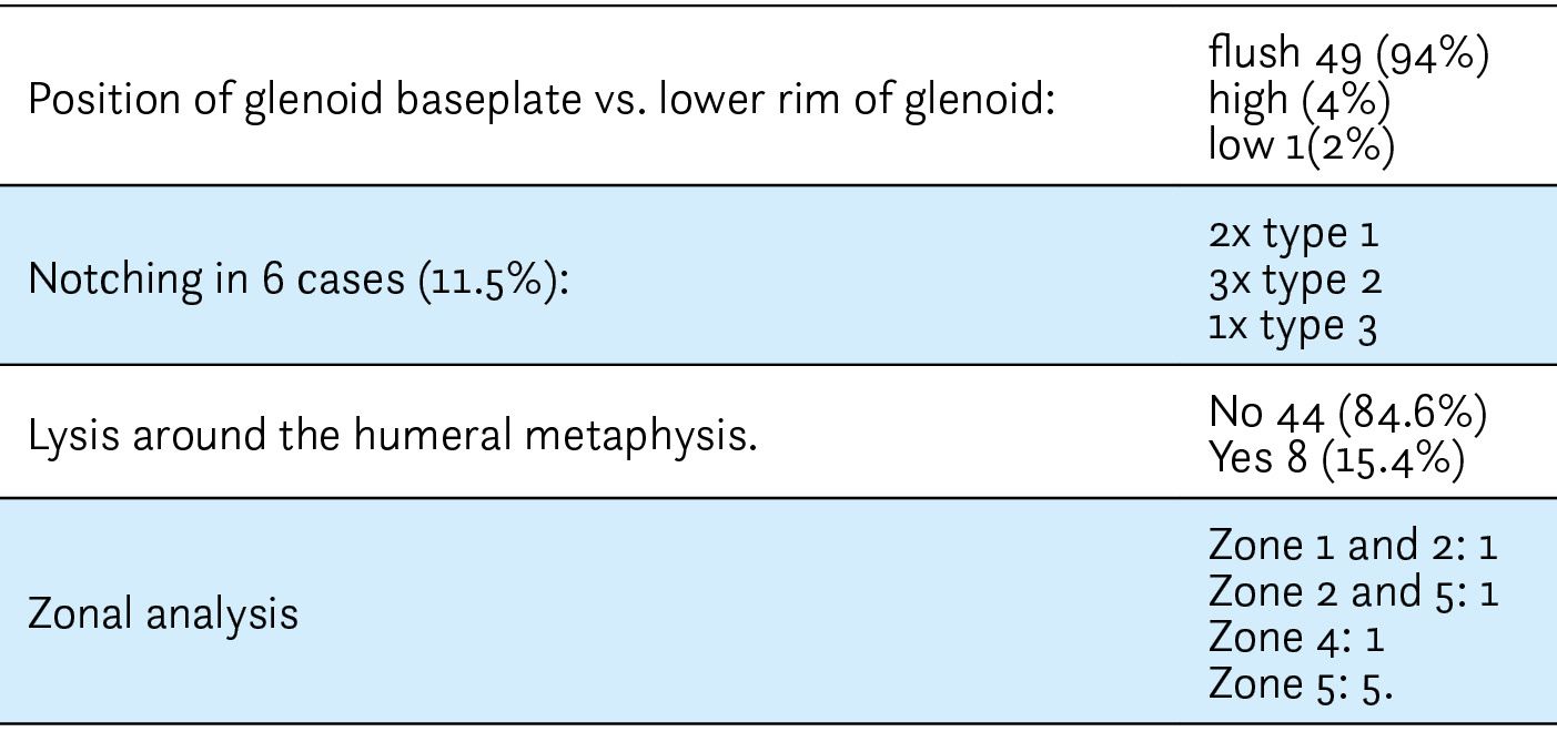 Radiographic analysis for the 52 usable x-rays are summarized in Table 2. Analysis based entirely on a frontal x-ray: position of glenoid implant, notching, humeral lysis (5 zones – see Figure 7)