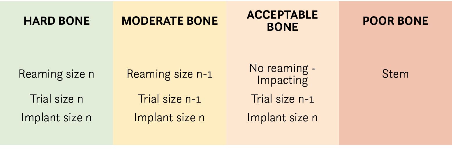 a. If the bone is hard and good quality, there is no need to alter the procedural steps, namely size-for-size reaming, implant of the trial component, followed by implant of the definitive component.