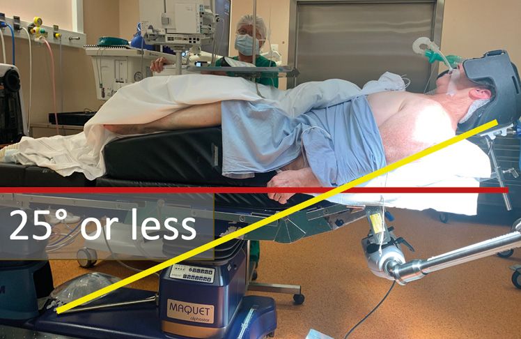 a. Patient set-up should be closer to dorsal decubitus, than semi-seated. This has two advantages - less constriction when dislocating the humeral head, and better cerebral perfusion (Fig. 9).
