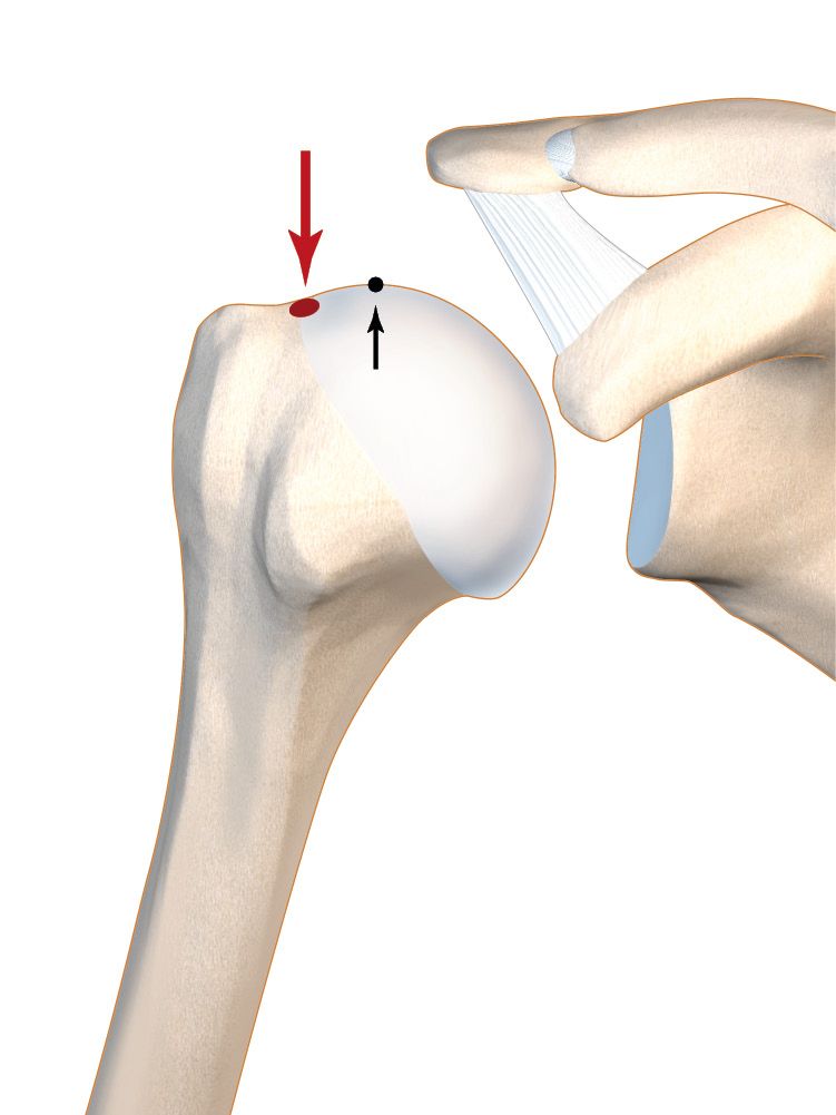 b. The upper insertion of the subscapularis tendon can be used to guide the height of the cut. The cut certainly shouldn't go beyond this point and can even be smaller to preserve a little more of the bone (Fig. 10).