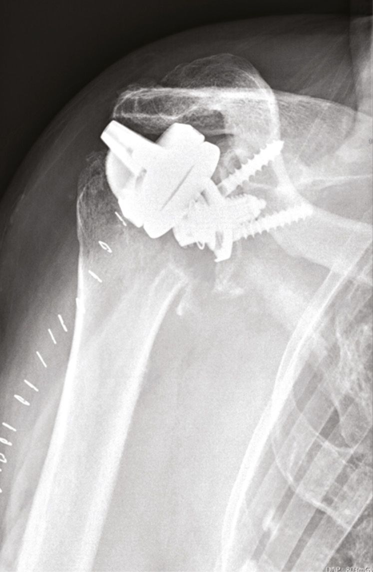 The configuration is different for a reverse arthroplasty (RTSA), which is more constrained especially on the humeral component. Patients tend to be older with lesser quality bone stock, which can compromise the primary fixation. A specific complication is early humeral loosening.