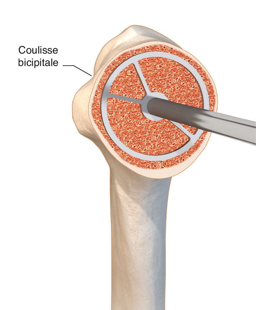 b.Peel technique. The tendon is reinserted with a transosseous suture or onto bone anchors, which are easy to place thanks to the absence of a stem.